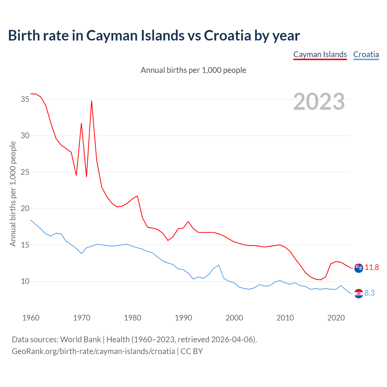 The Cayman Islands has an annual birth rate of 11.8 births per 1,000 people, compared to 8.3 for Croatia. The average number of children a woman is expected to have during her lifetime — the fertility rate, is 1.53 in the Cayman Islands and 1.46 in Croatia — 4.64% difference.
