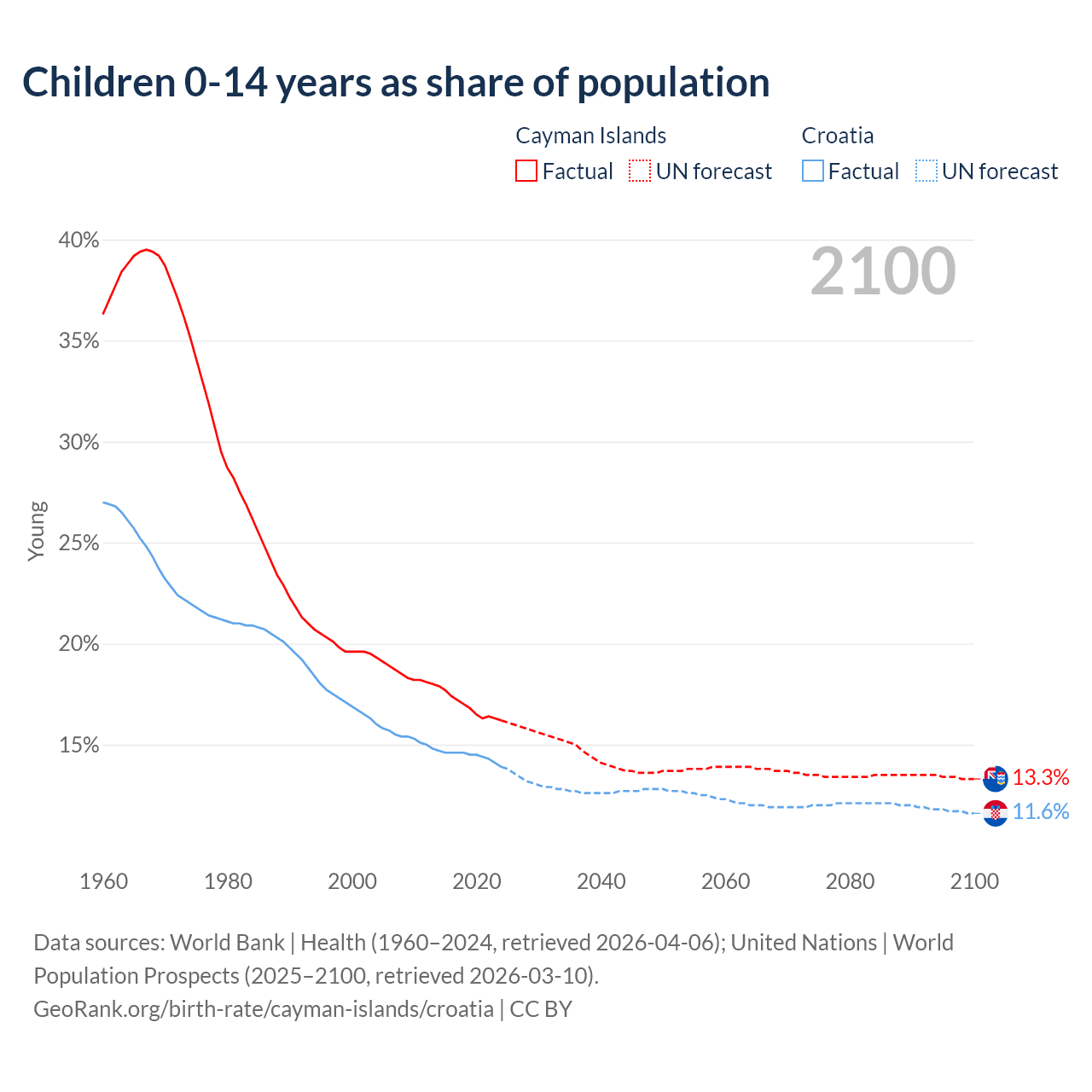 Children aged 0-14 make up 16.2% of the population in the Cayman Islands and 13.9% in Croatia in 2024, compared to 22.3% and 19.8% respectively in 1990.