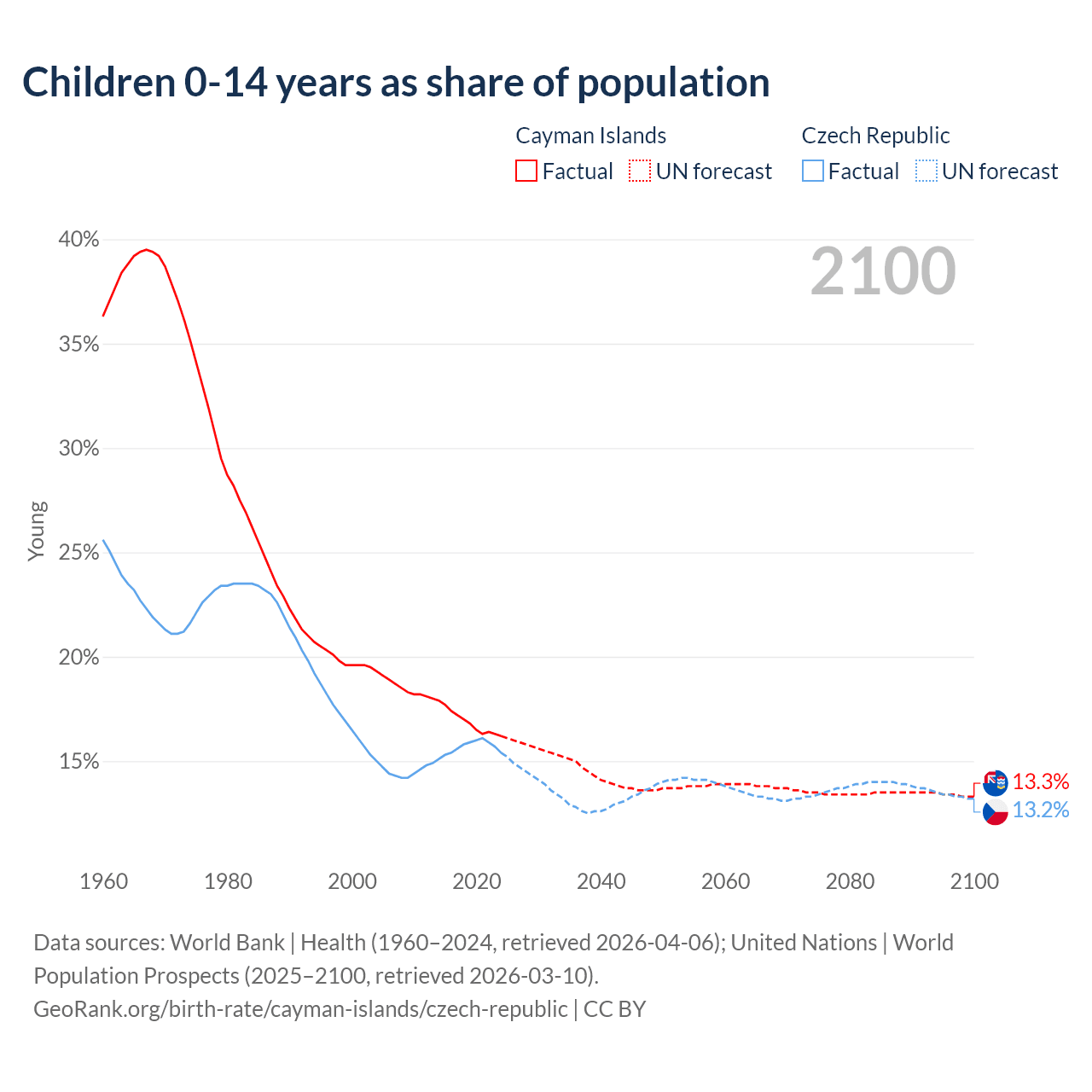 Children aged 0-14 make up 16.2% of the population in the Cayman Islands and 15.4% in the Czech Republic in 2024, compared to 22.3% and 21.4% respectively in 1990.