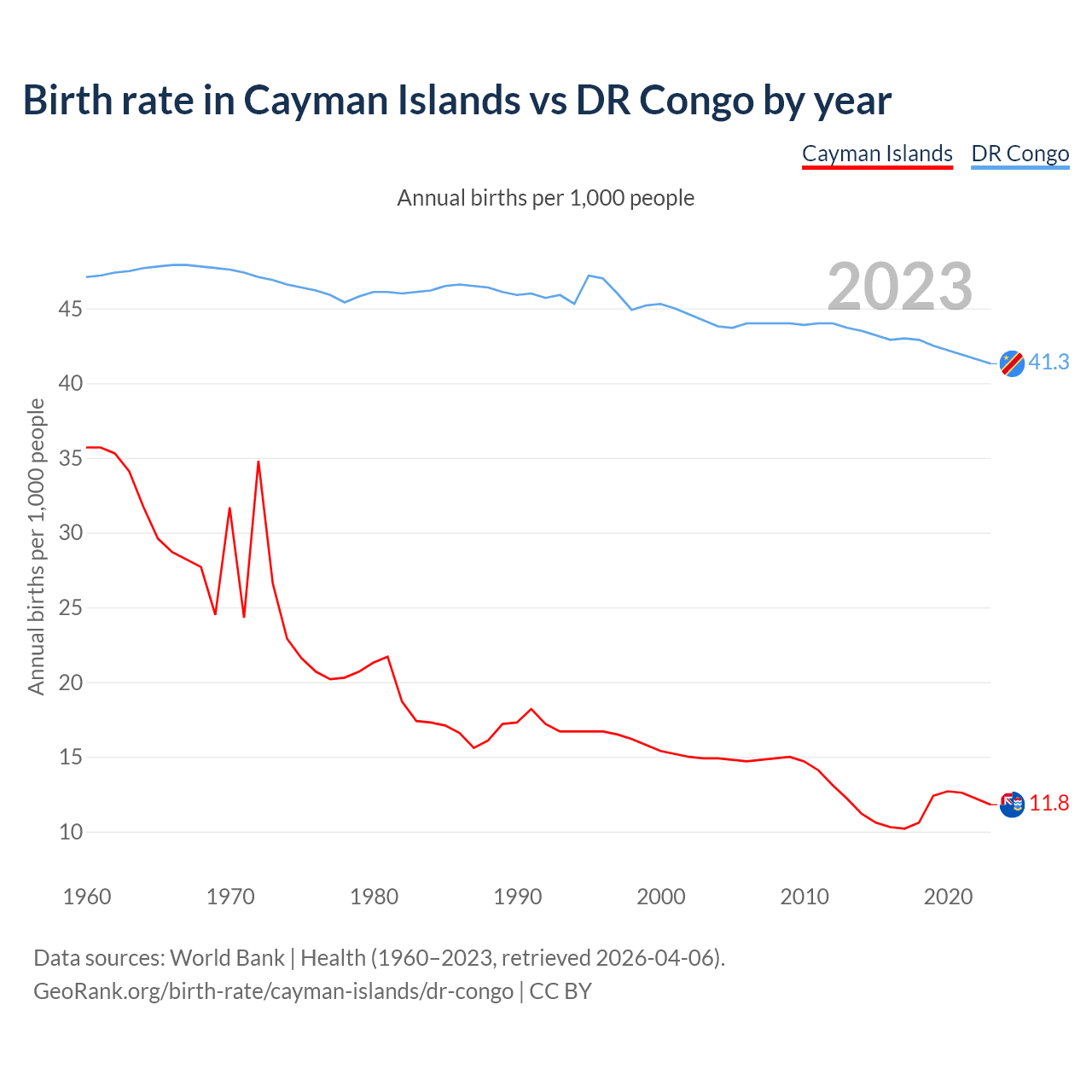 The Cayman Islands has an annual birth rate of 11.8 births per 1,000 people, compared to 41.3 for the DR Congo. The average number of children a woman is expected to have during her lifetime — the fertility rate, is 1.53 in the Cayman Islands and 6.05 in the DR Congo — 295.2% difference.
