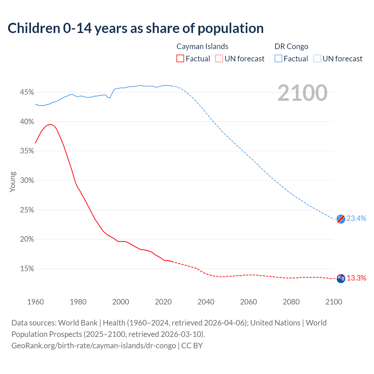 According to the latest available data on birth rates, the fertility rate in the Cayman Islands was 1.53 children per woman in 2023, compared to 6.05 in the DR Congo in 2023. The replacement level is considered to be 2.1 children per woman.