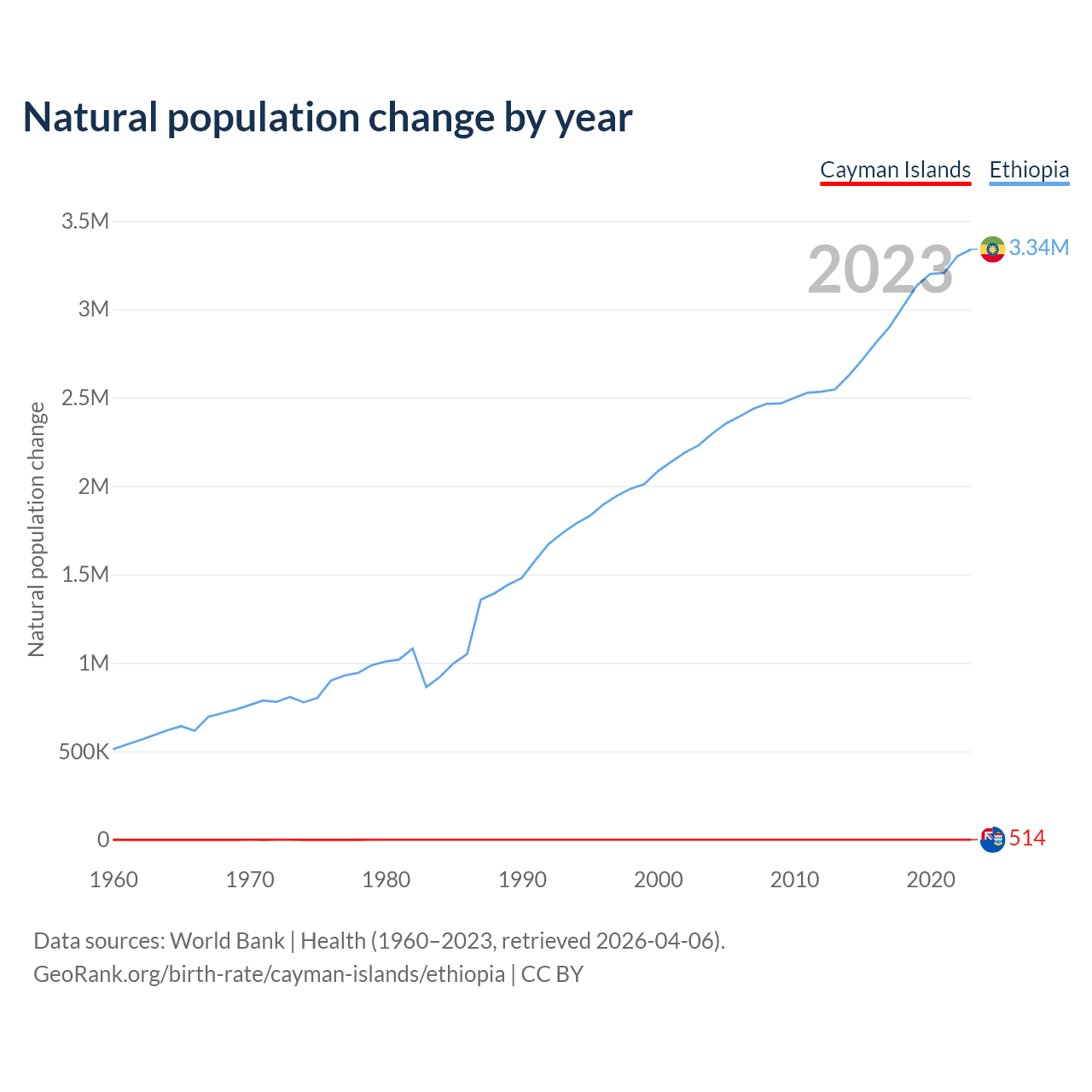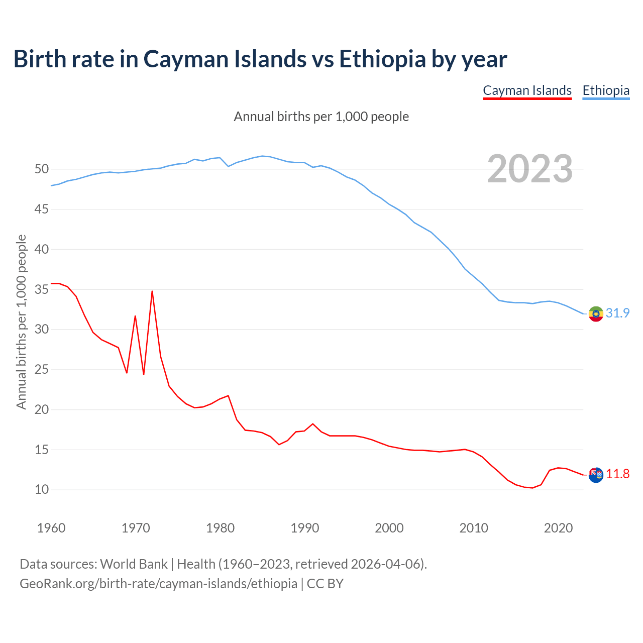 The Cayman Islands has an annual birth rate of 11.8 births per 1,000 people, compared to 31.9 for Ethiopia. The average number of children a woman is expected to have during her lifetime — the fertility rate, is 1.53 in the Cayman Islands and 3.99 in Ethiopia — 160.5% difference.