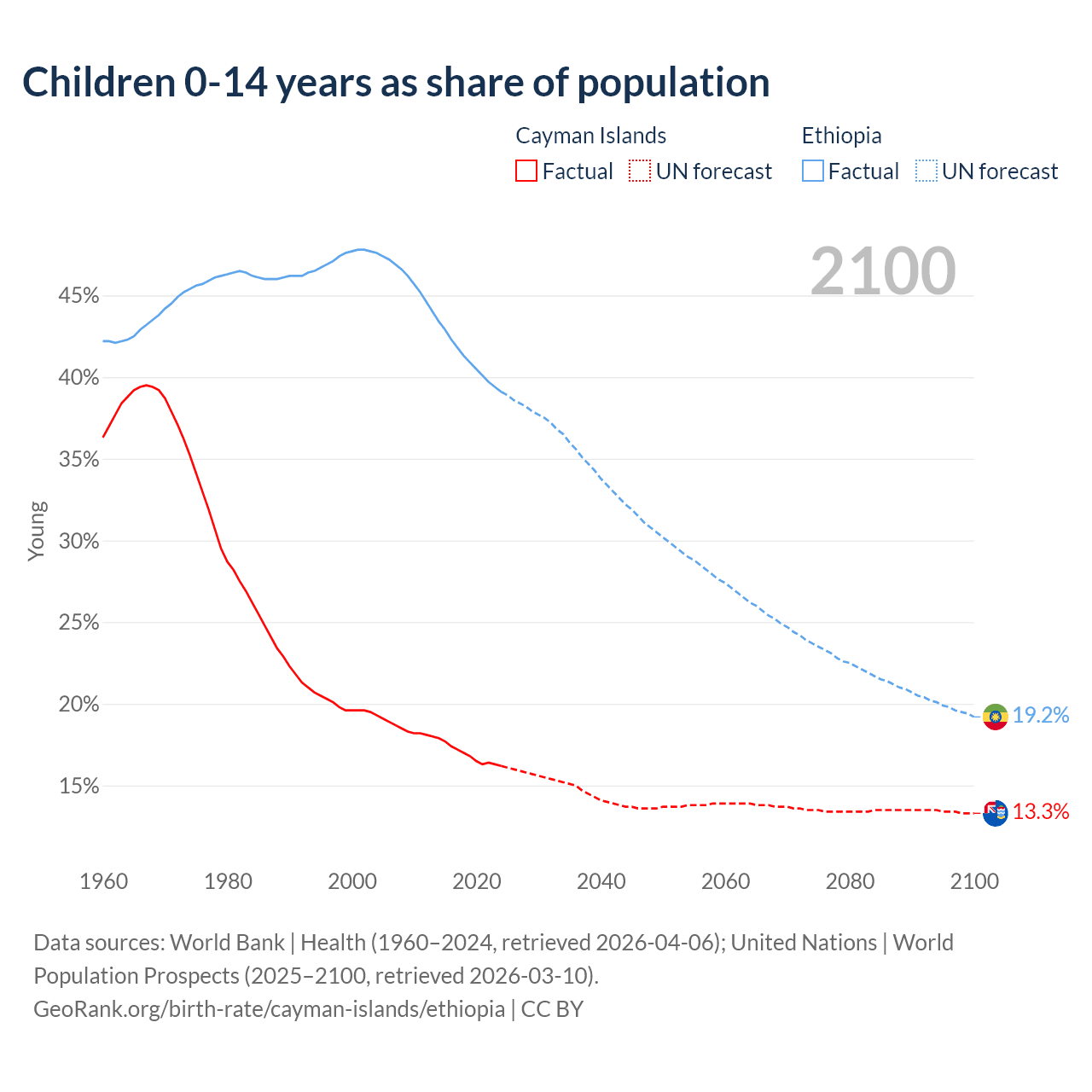 According to the latest available data on birth rates, the fertility rate in the Cayman Islands was 1.53 children per woman in 2023, compared to 3.99 in Ethiopia in 2023. The replacement level is considered to be 2.1 children per woman.