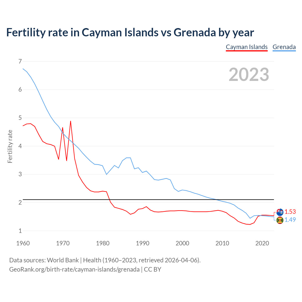 1960 vs 2023, the fertility rate has decreased by 67.5% in the Cayman Islands and by 77.9% in Grenada — in 1960, it was 4.71 and 6.74, respectively.