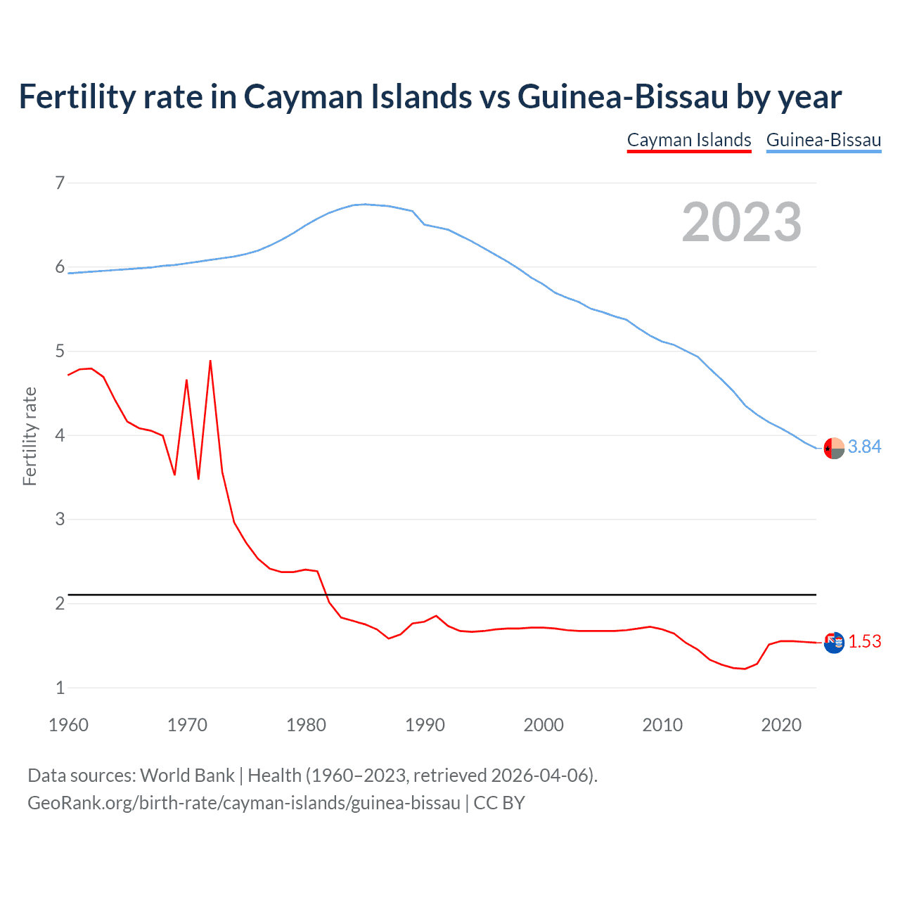 According to the latest available data on birth rates, the fertility rate in the Cayman Islands was 1.53 children per woman in 2023, compared to 3.84 in Guinea-Bissau in 2023. The replacement level is considered to be 2.1 children per woman.