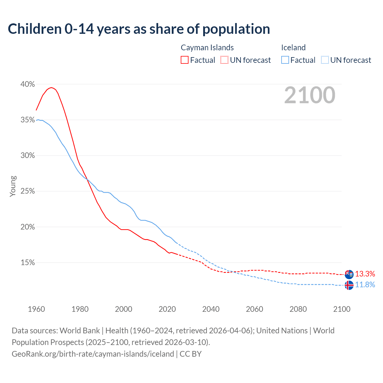 Children aged 0-14 make up 16.2% of the population in the Cayman Islands and 17.8% in Iceland in 2024, compared to 22.3% and 25% respectively in 1990.