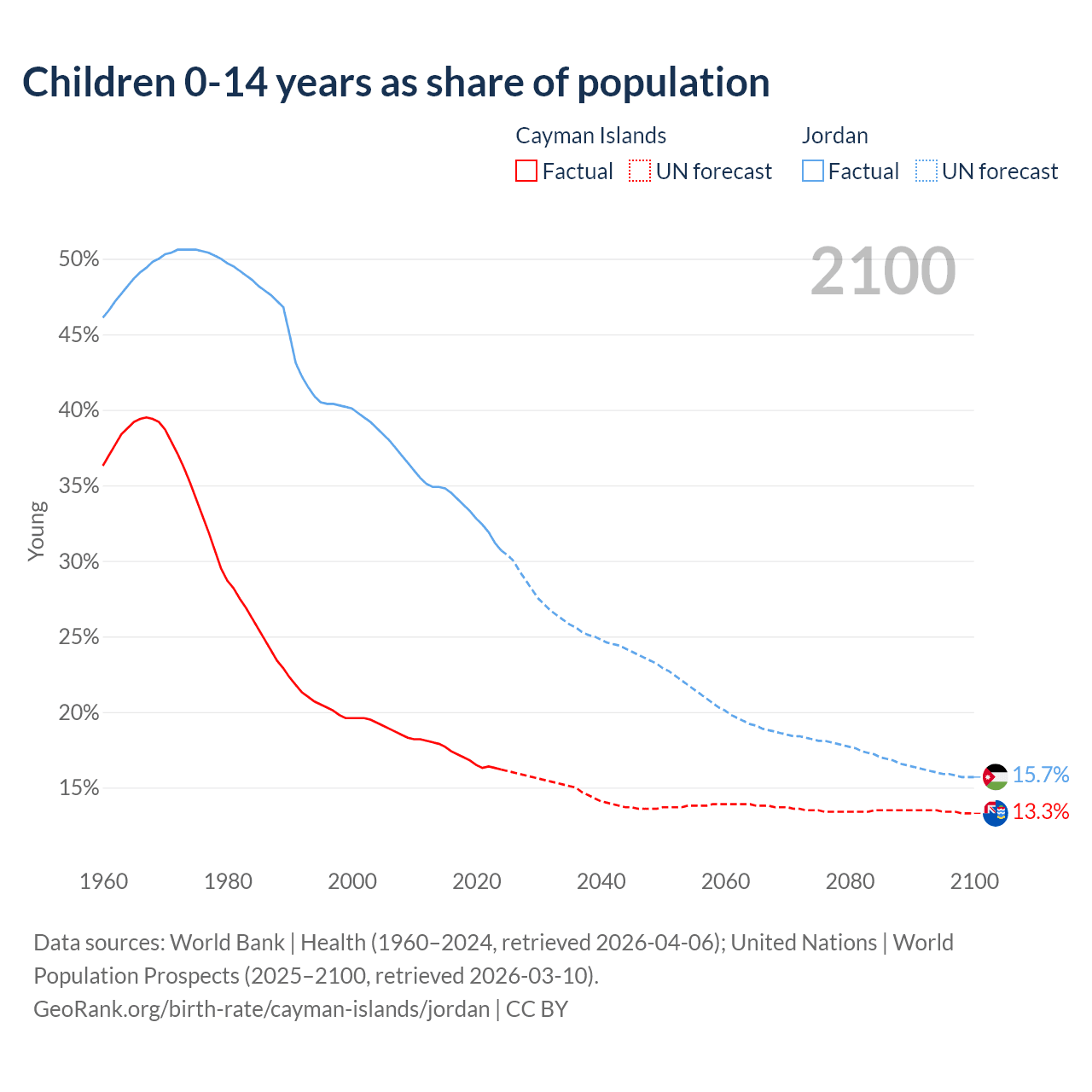 According to the latest available data on birth rates, the fertility rate in the Cayman Islands was 1.53 children per woman in 2023, compared to 2.64 in Jordan in 2023. The replacement level is considered to be 2.1 children per woman.