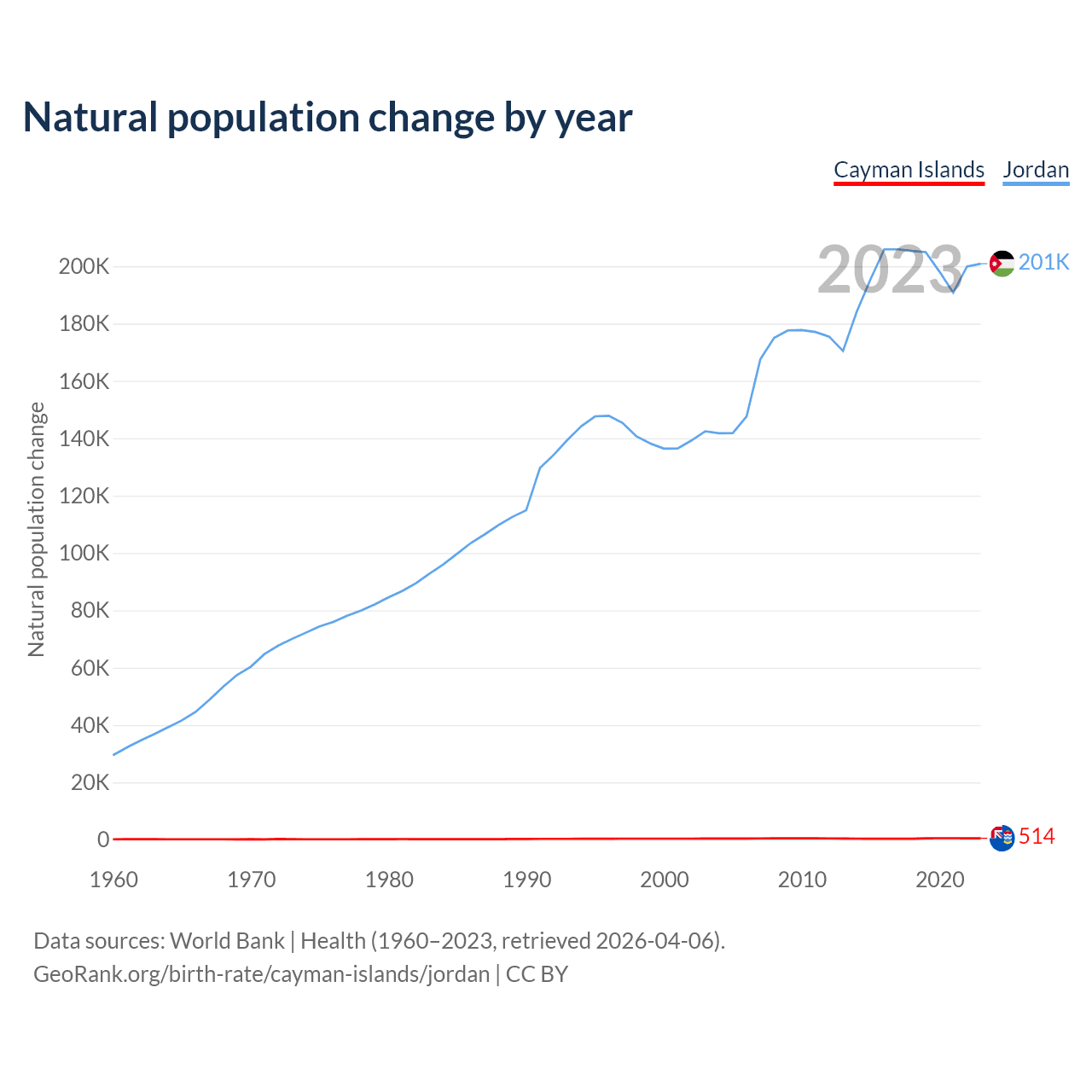 The Cayman Islands has an annual birth rate of 11.8 births per 1,000 people, compared to 20.6 for Jordan. The average number of children a woman is expected to have during her lifetime — the fertility rate, is 1.53 in the Cayman Islands and 2.64 in Jordan — 72.4% difference.