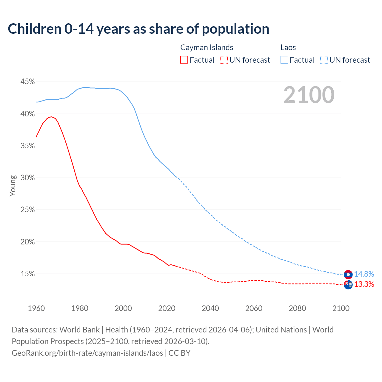 According to the latest available data on birth rates, the fertility rate in the Cayman Islands was 1.53 children per woman in 2023, compared to 2.42 in Laos in 2023. The replacement level is considered to be 2.1 children per woman.