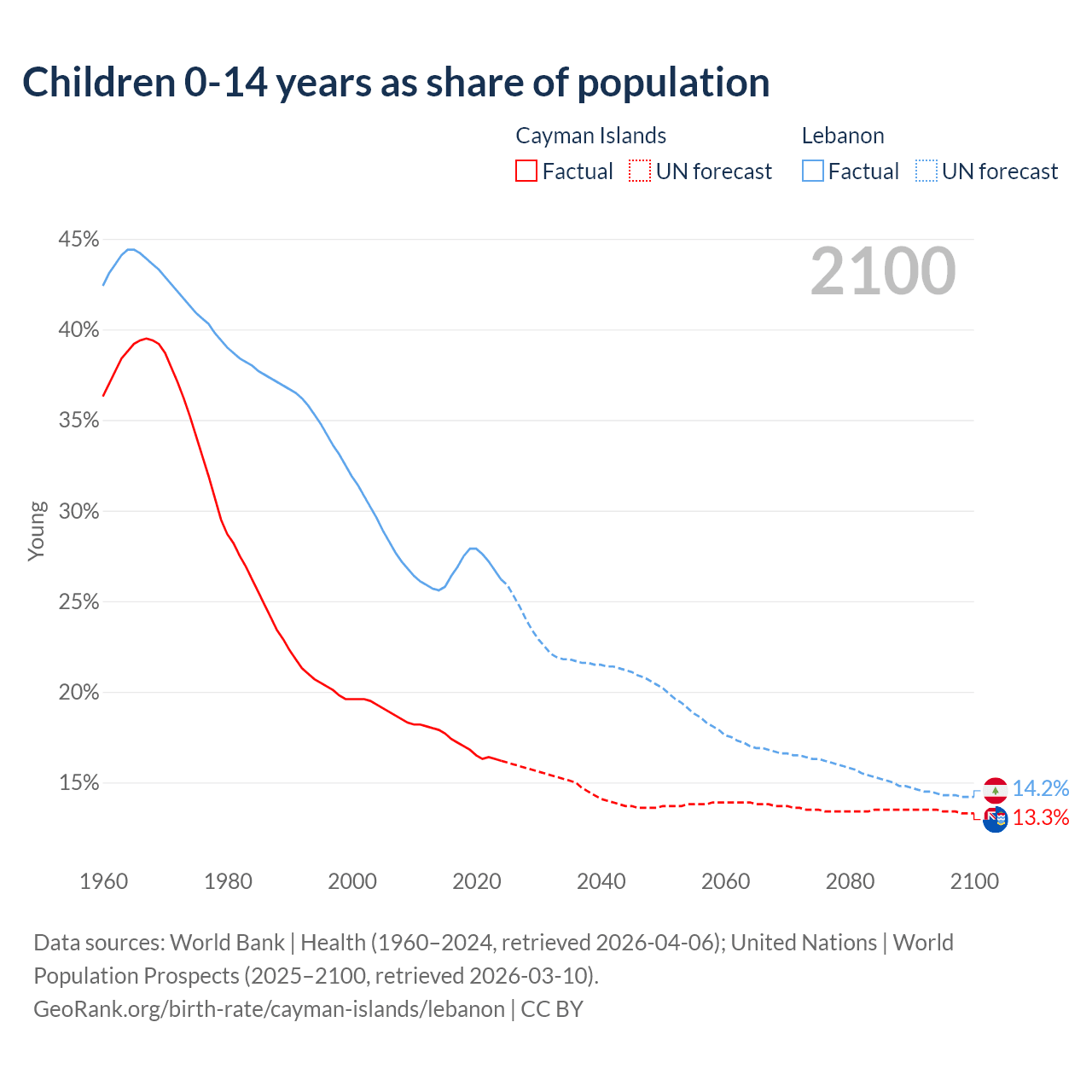 Children aged 0-14 make up 16.2% of the population in the Cayman Islands and 26.2% in Lebanon in 2024, compared to 22.3% and 36.7% respectively in 1990.