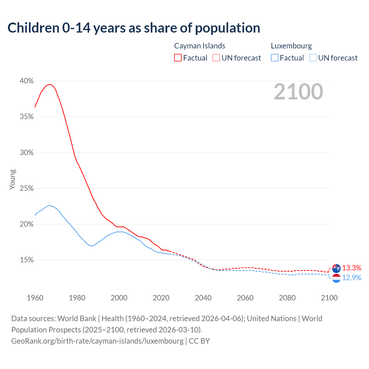 Children aged 0-14 make up 16.2% of the population in the Cayman Islands and 15.8% in Luxembourg in 2024, compared to 22.3% and 17.4% respectively in 1990.
