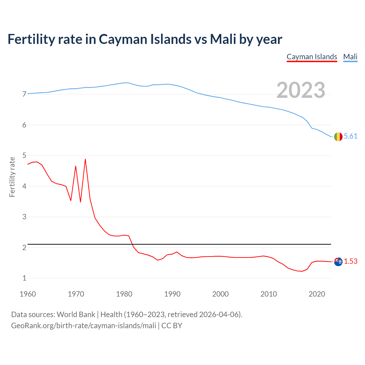 1960 vs 2023, the fertility rate has decreased by 67.5% in the Cayman Islands and by 20% in Mali — in 1960, it was 4.71 and 7.02, respectively.