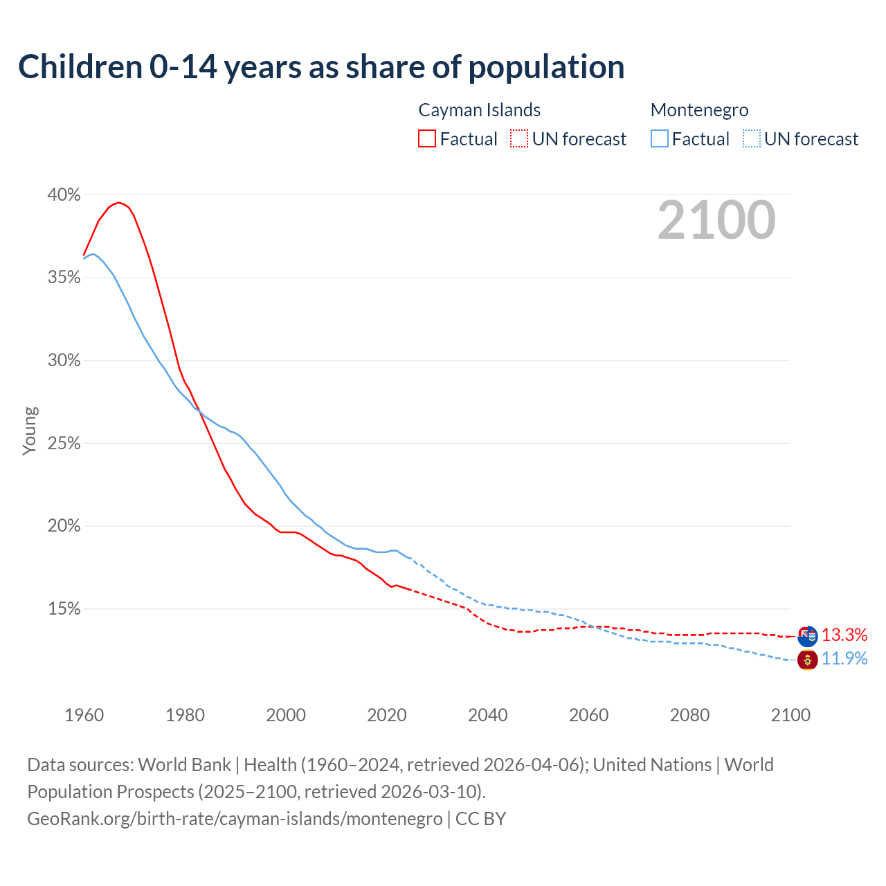 Children aged 0-14 make up 16.2% of the population in the Cayman Islands and 18.1% in Montenegro in 2024, compared to 22.3% and 25.6% respectively in 1990.