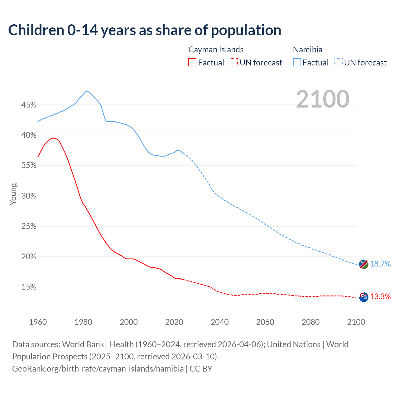 Children aged 0-14 make up 16.2% of the population in the Cayman Islands and 37% in Namibia in 2024, compared to 22.3% and 42.3% respectively in 1990.