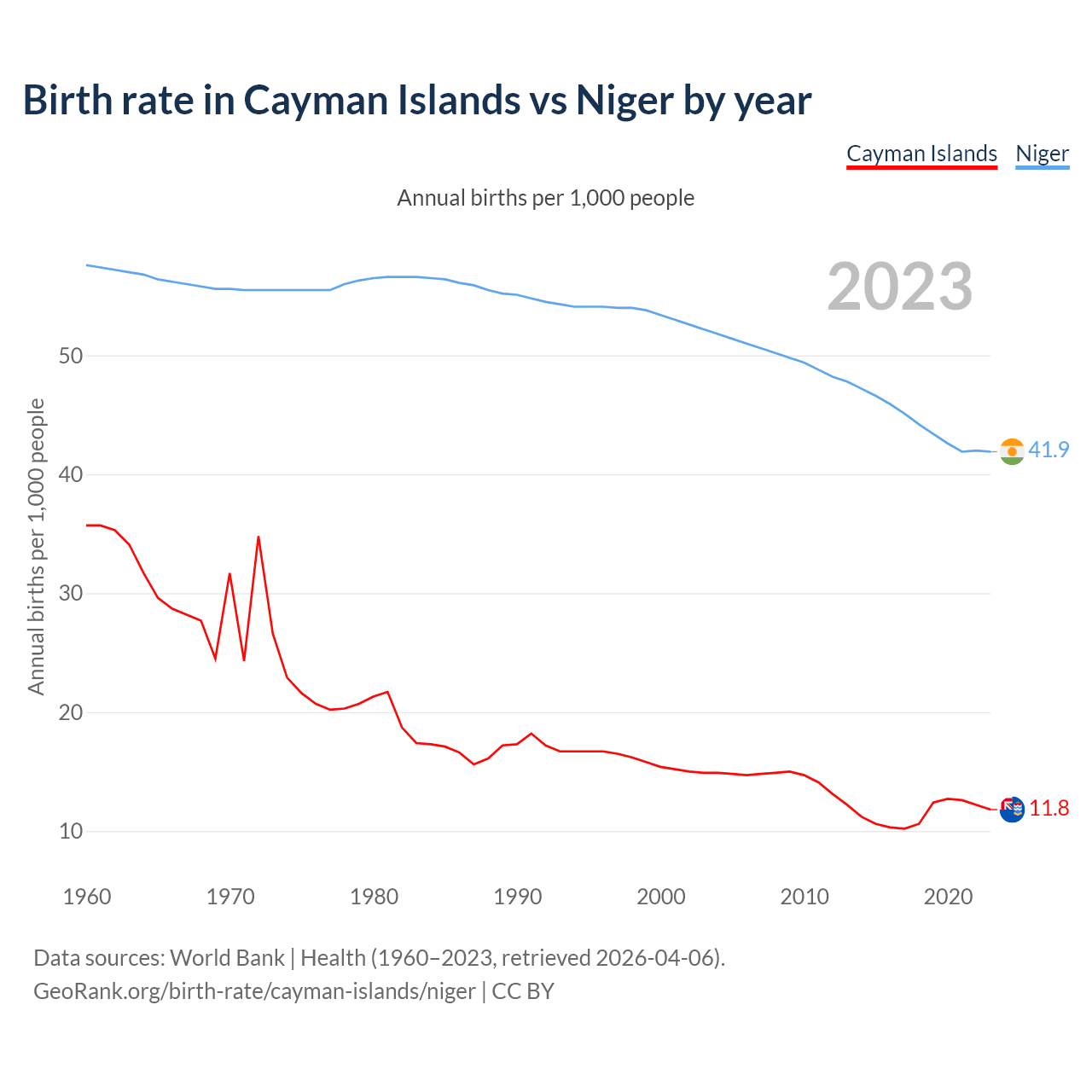 The Cayman Islands has an annual birth rate of 11.8 births per 1,000 people, compared to 41.9 for Niger. The average number of children a woman is expected to have during her lifetime — the fertility rate, is 1.53 in the Cayman Islands and 6.06 in Niger — 295.9% difference.