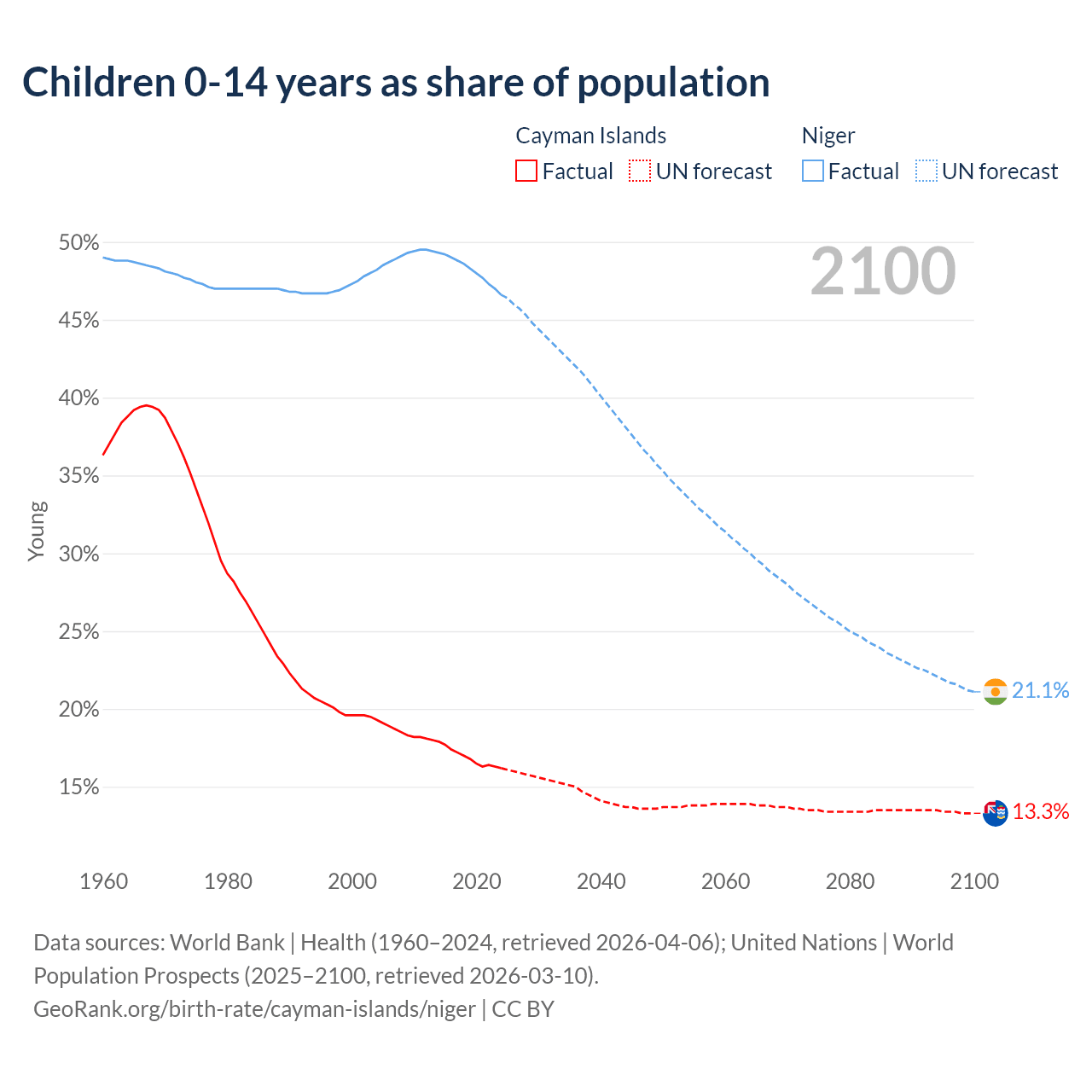 According to the latest available data on birth rates, the fertility rate in the Cayman Islands was 1.53 children per woman in 2023, compared to 6.06 in Niger in 2023. The replacement level is considered to be 2.1 children per woman.