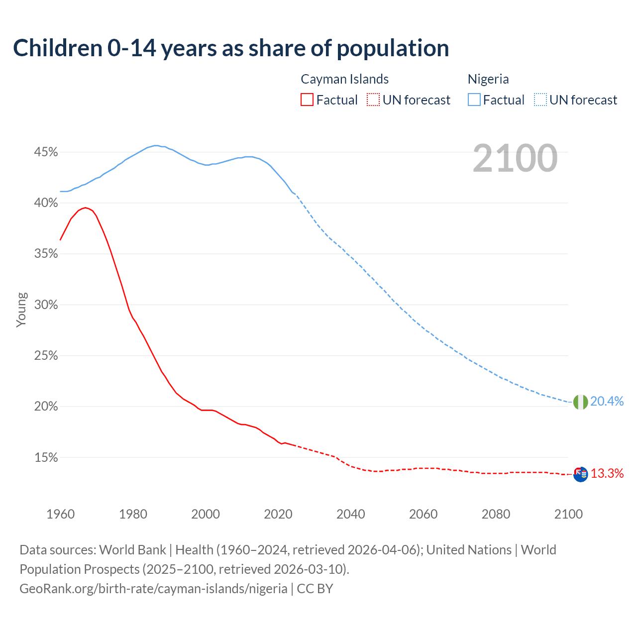 Children aged 0-14 make up 16.2% of the population in the Cayman Islands and 41% in Nigeria in 2024, compared to 22.3% and 45.3% respectively in 1990.