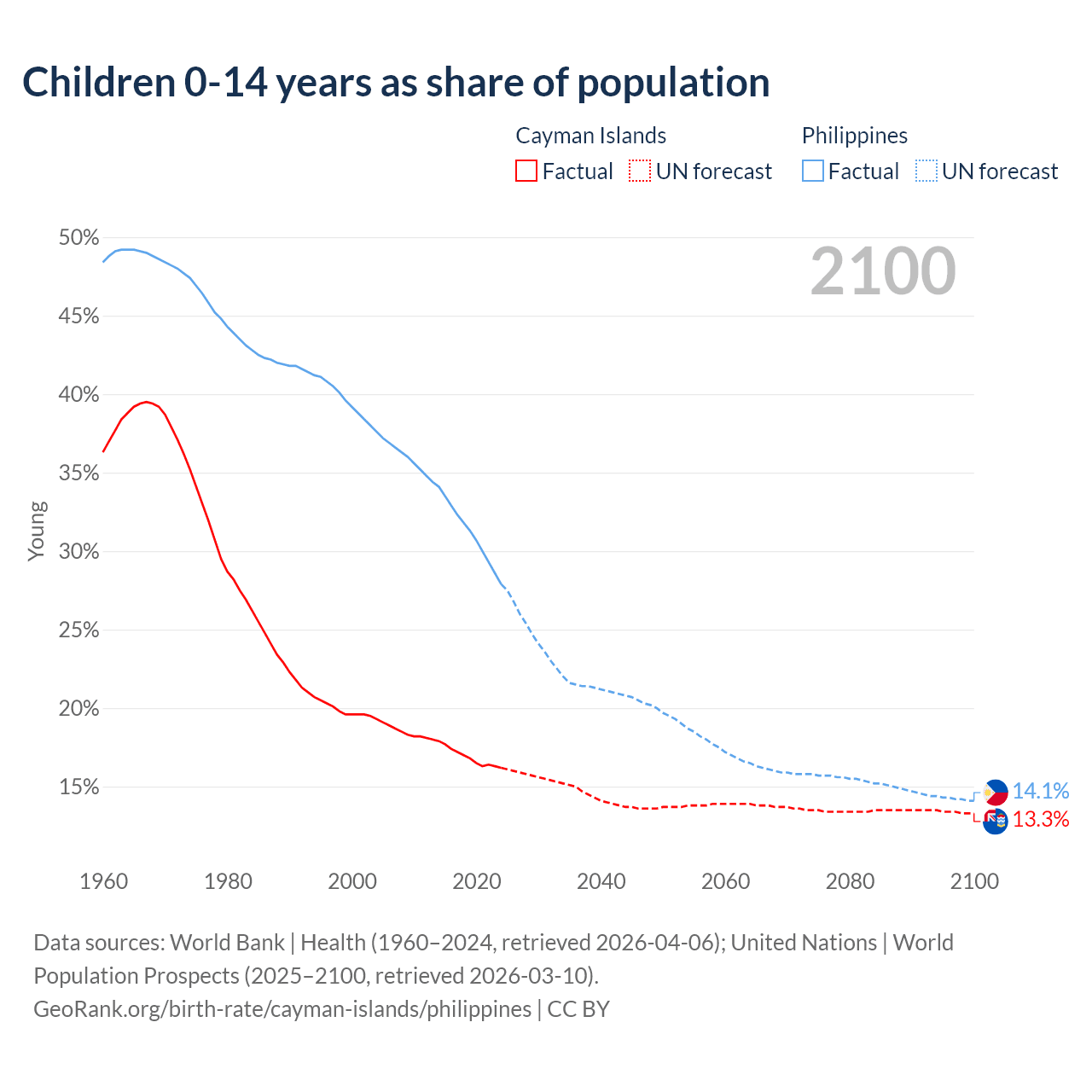 Children aged 0-14 make up 16.2% of the population in the Cayman Islands and 27.9% in the Philippines in 2024, compared to 22.3% and 41.8% respectively in 1990.