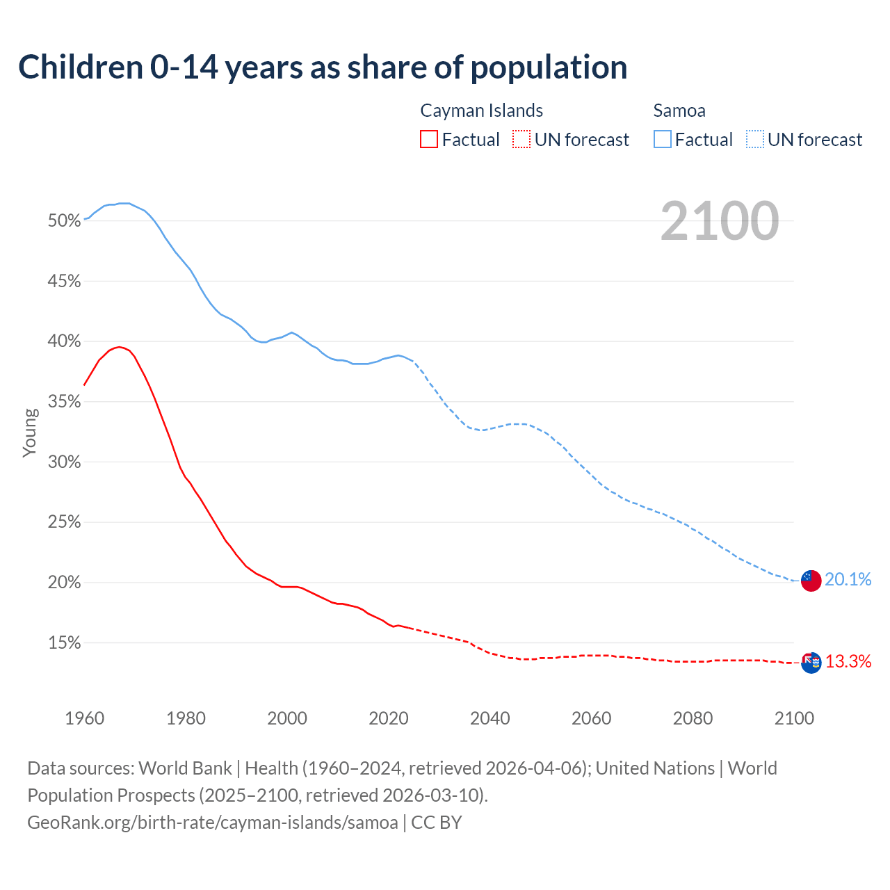 Children aged 0-14 make up 16.2% of the population in the Cayman Islands and 38.5% in Samoa in 2024, compared to 22.3% and 41.5% respectively in 1990.