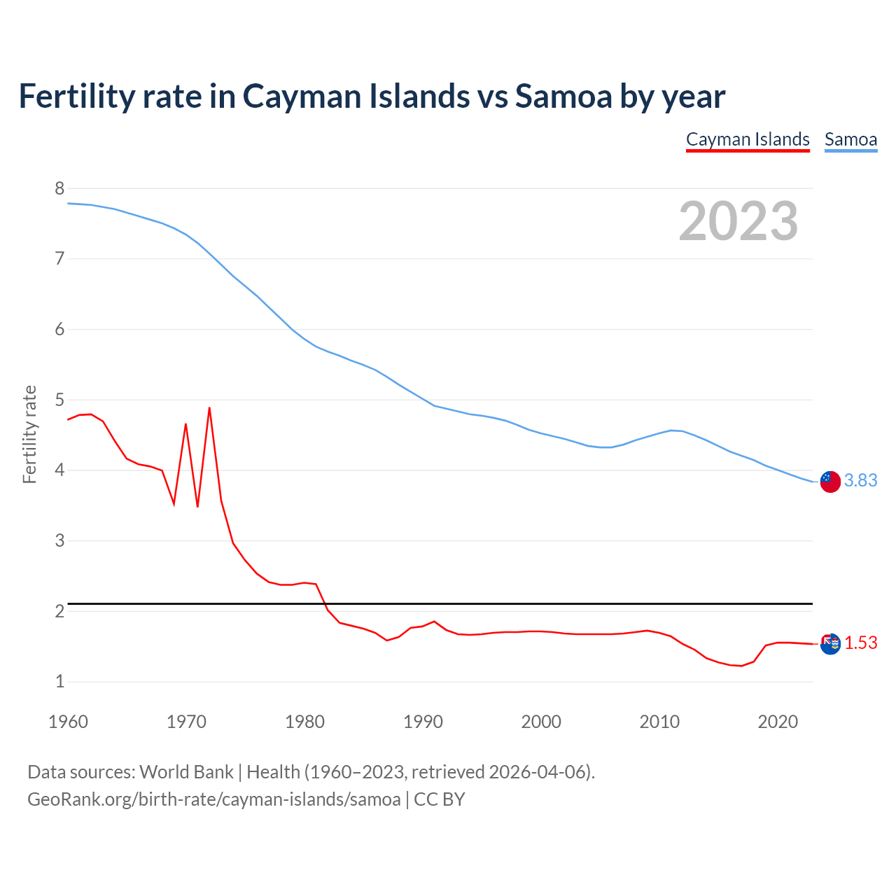 According to the latest available data on birth rates, the fertility rate in the Cayman Islands was 1.53 children per woman in 2023, compared to 3.83 in Samoa in 2023. The replacement level is considered to be 2.1 children per woman.
