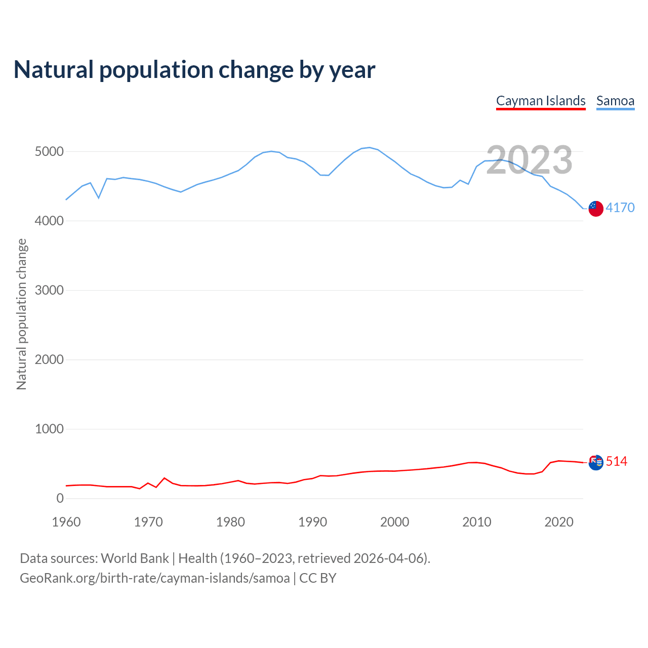 The Cayman Islands has an annual birth rate of 11.8 births per 1,000 people, compared to 25.4 for Samoa. The average number of children a woman is expected to have during her lifetime — the fertility rate, is 1.53 in the Cayman Islands and 3.83 in Samoa — 150.1% difference.