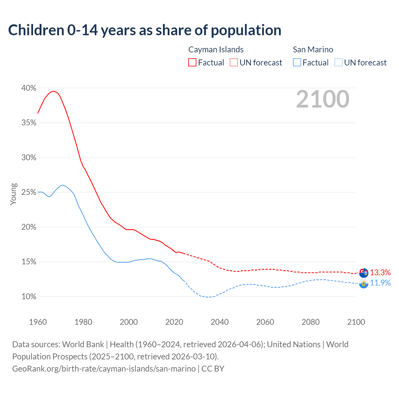 Children aged 0-14 make up 16.2% of the population in the Cayman Islands and 12.3% in San Marino in 2024, compared to 22.3% and 16.1% respectively in 1990.