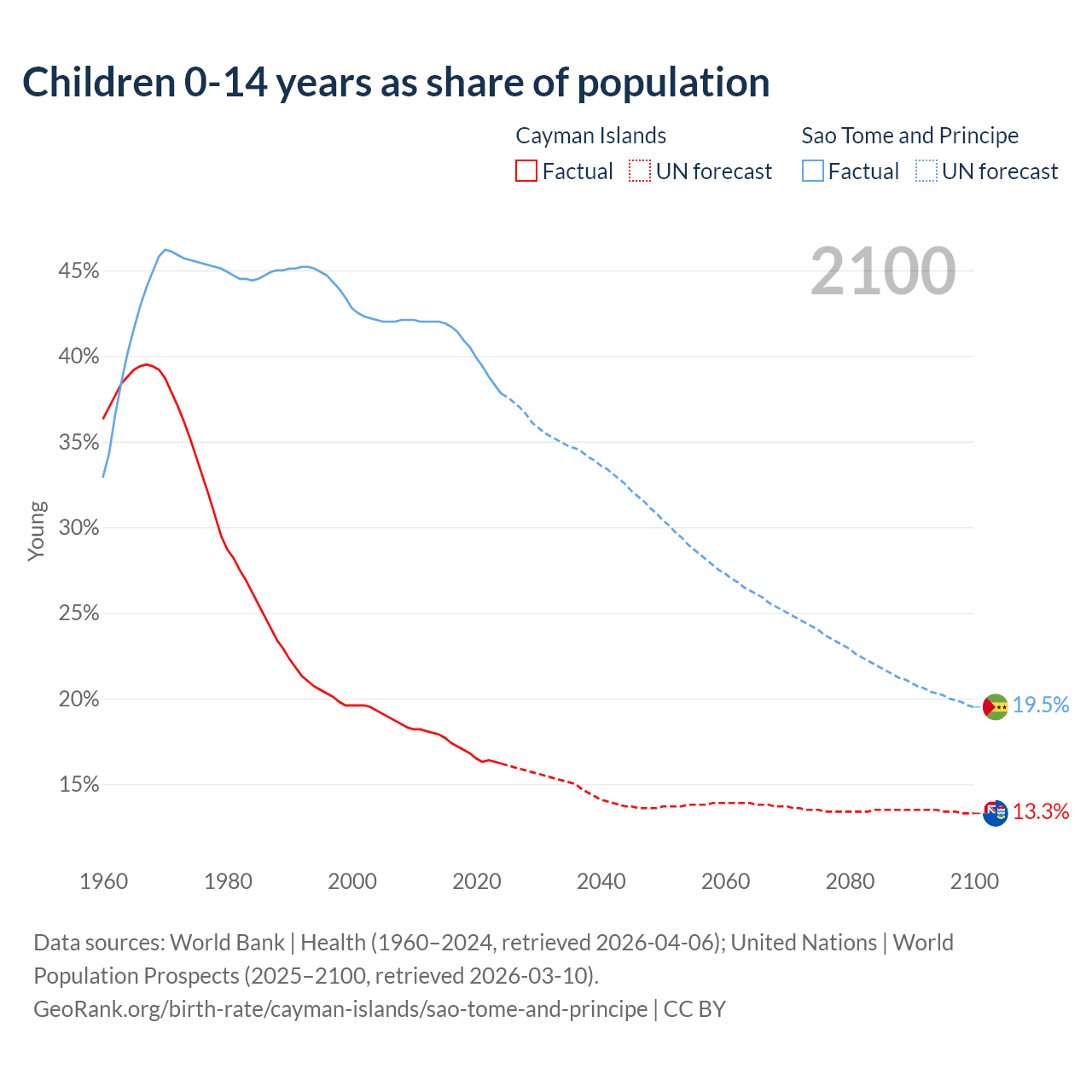 According to the latest available data on birth rates, the fertility rate in the Cayman Islands was 1.53 children per woman in 2023, compared to 3.64 in Sao Tome and Principe in 2023. The replacement level is considered to be 2.1 children per woman.