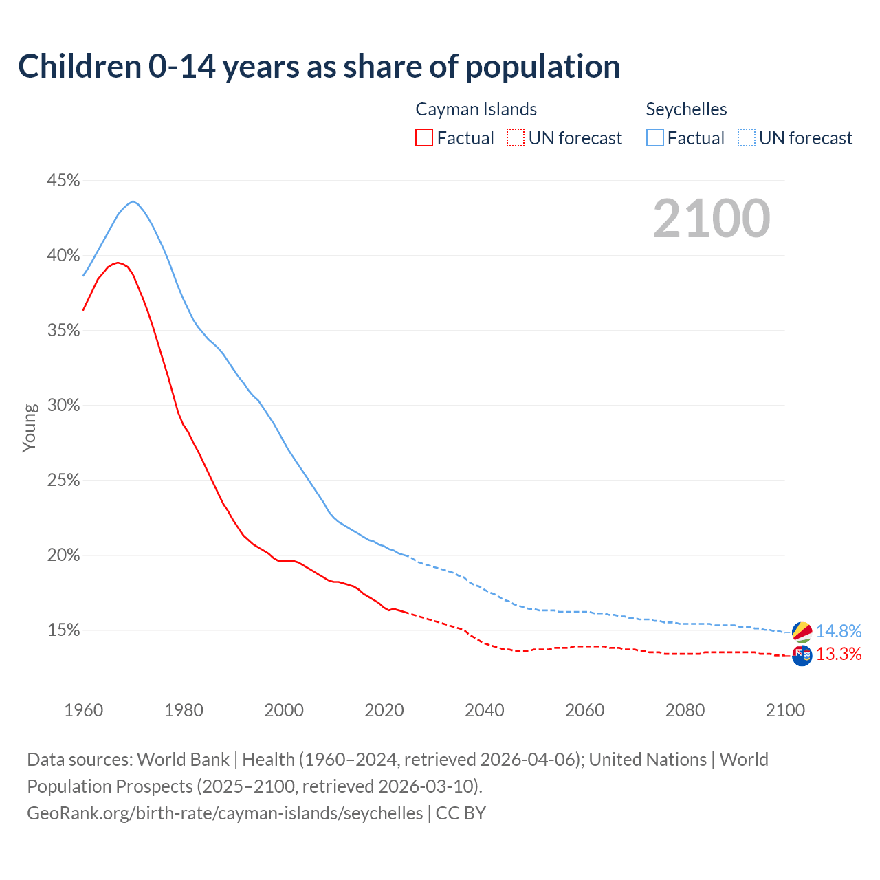 Children aged 0-14 make up 16.2% of the population in the Cayman Islands and 20% in the Seychelles in 2024, compared to 22.3% and 32.4% respectively in 1990.