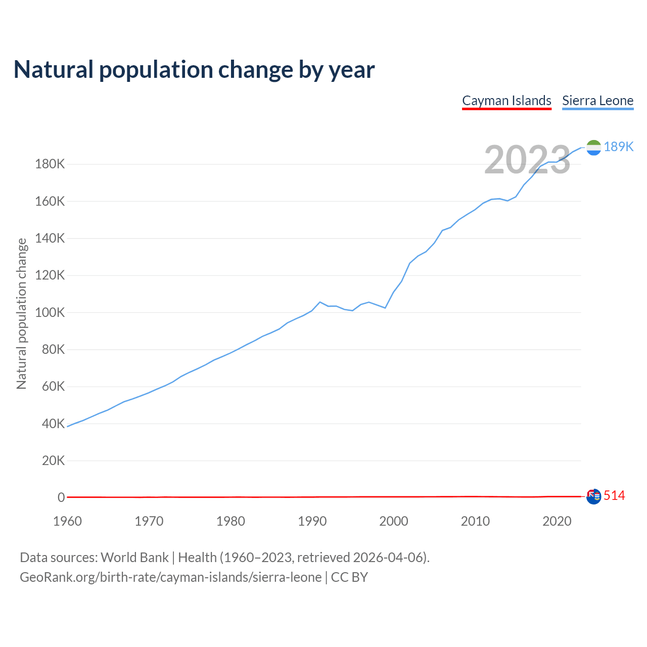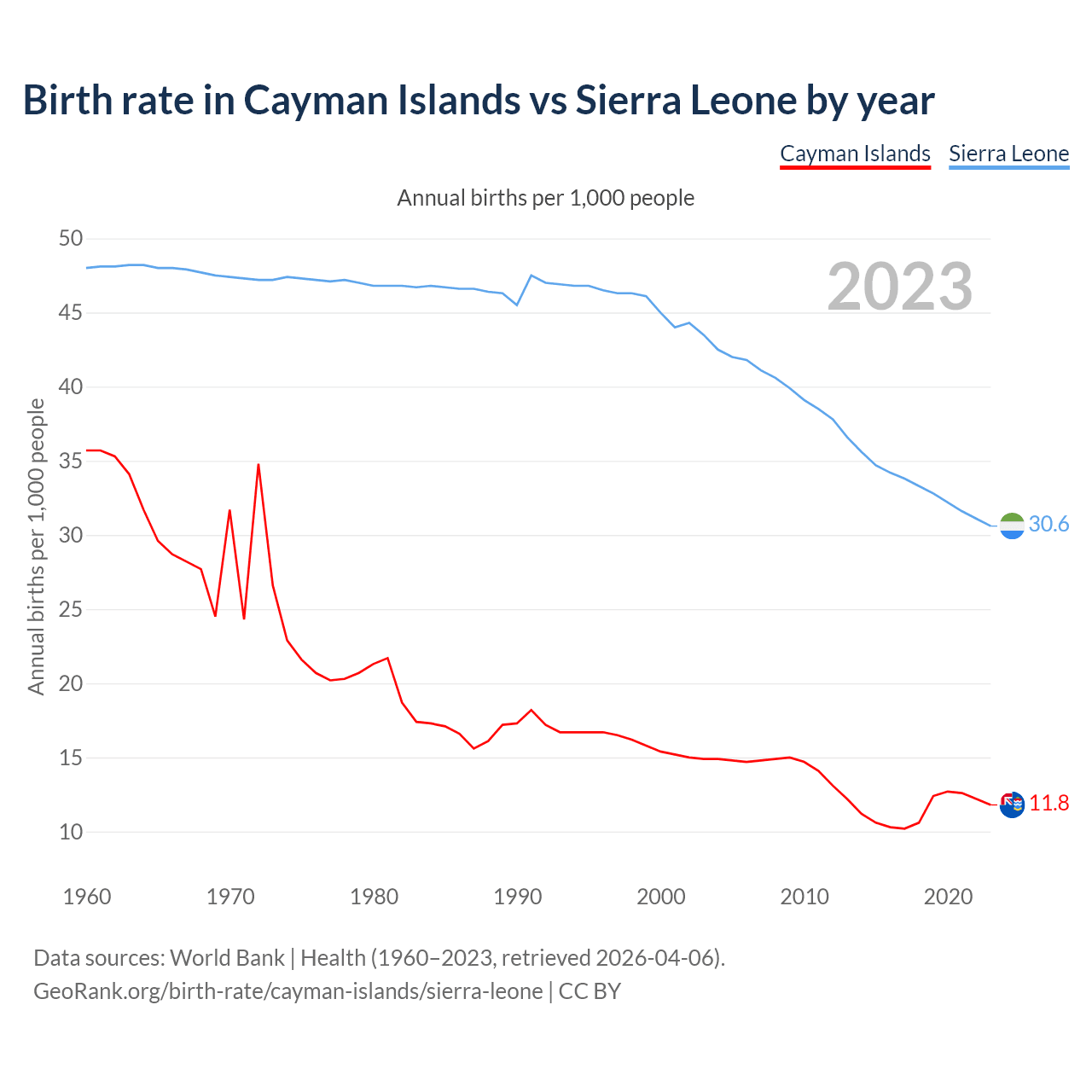 The Cayman Islands has an annual birth rate of 11.8 births per 1,000 people, compared to 30.6 for Sierra Leone. The average number of children a woman is expected to have during her lifetime — the fertility rate, is 1.53 in the Cayman Islands and 3.79 in Sierra Leone — 147.6% difference.
