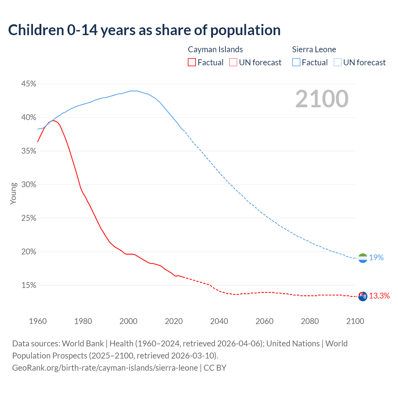 According to the latest available data on birth rates, the fertility rate in the Cayman Islands was 1.53 children per woman in 2023, compared to 3.79 in Sierra Leone in 2023. The replacement level is considered to be 2.1 children per woman.
