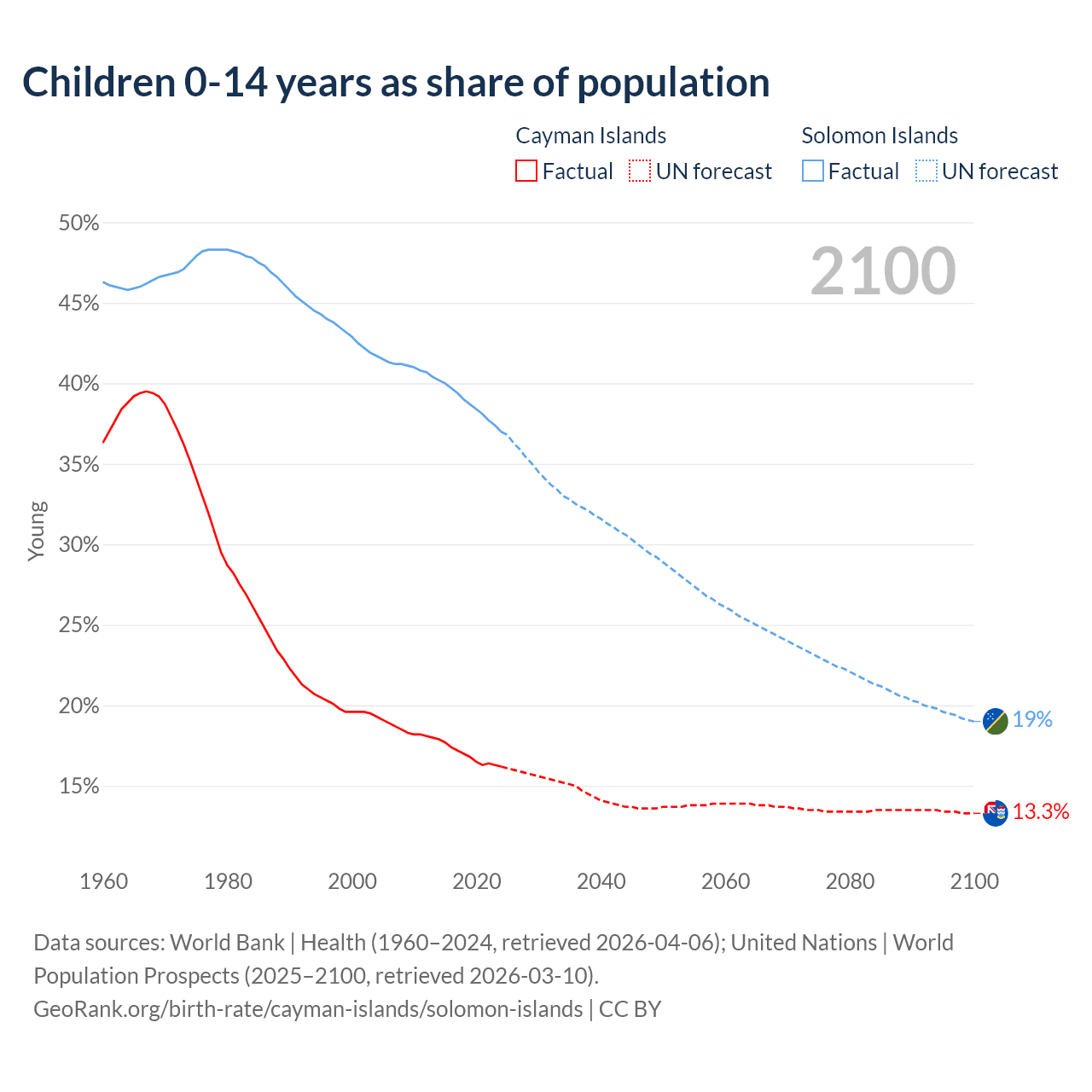 Children aged 0-14 make up 16.2% of the population in the Cayman Islands and 37% in the Solomon Islands in 2024, compared to 22.3% and 45.8% respectively in 1990.