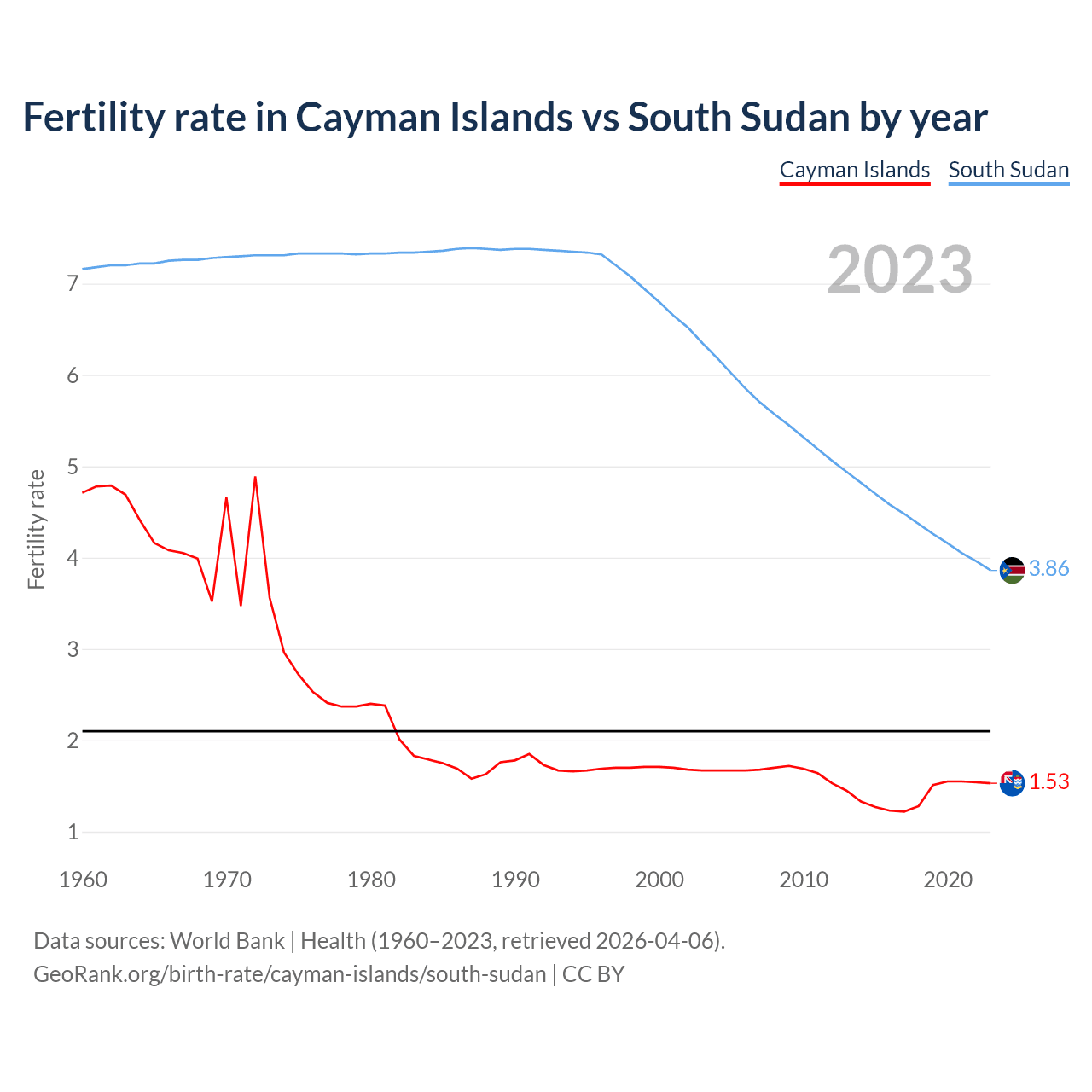 According to the latest available data on birth rates, the fertility rate in the Cayman Islands was 1.53 children per woman in 2023, compared to 3.86 in South Sudan in 2023. The replacement level is considered to be 2.1 children per woman.