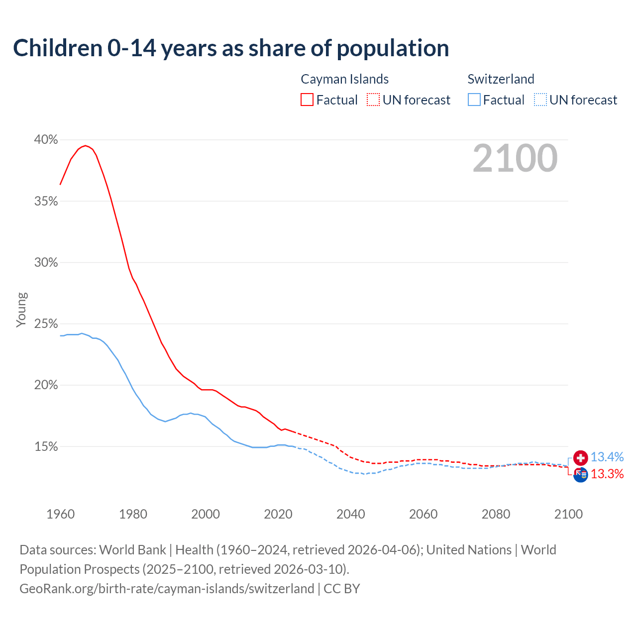 Children aged 0-14 make up 16.2% of the population in the Cayman Islands and 15% in Switzerland in 2024, compared to 22.3% and 17.1% respectively in 1990.