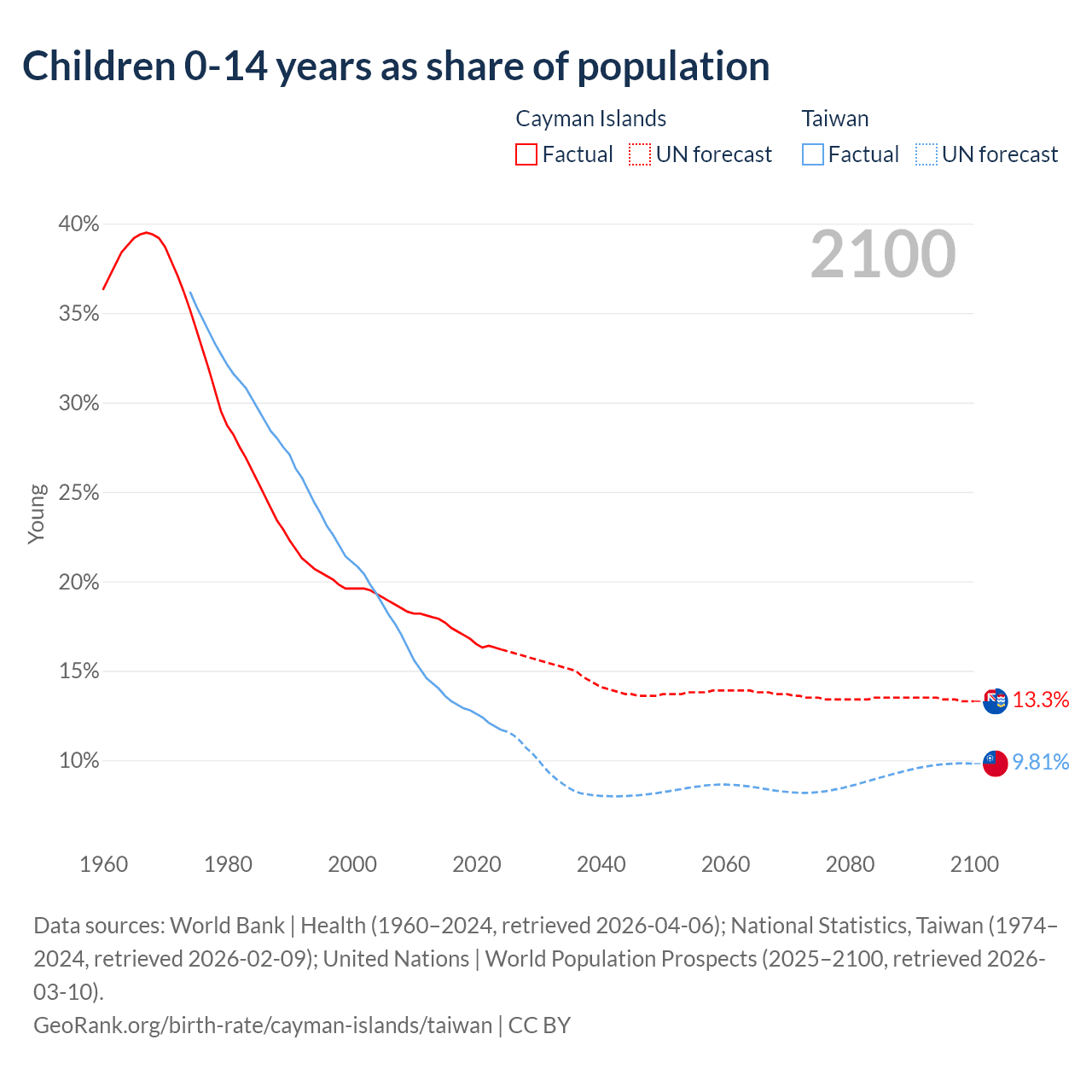 Children aged 0-14 make up 16.2% of the population in the Cayman Islands and 11.7% in Taiwan in 2024, compared to 22.3% and 27.1% respectively in 1990.