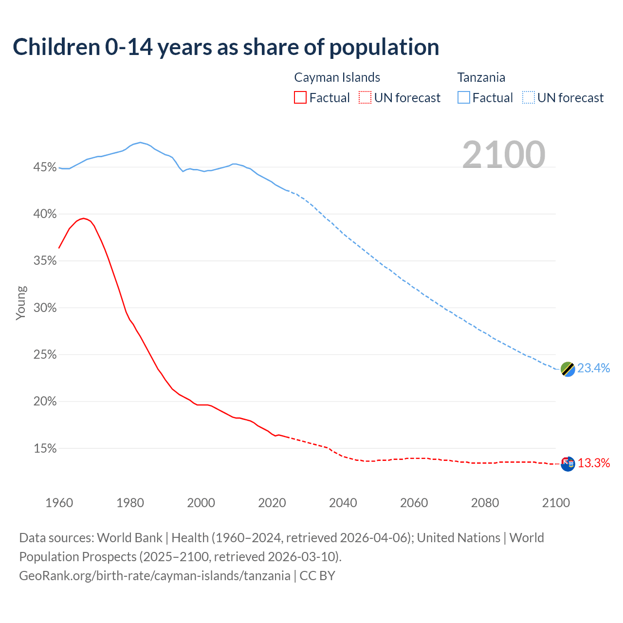 According to the latest available data on birth rates, the fertility rate in the Cayman Islands was 1.53 children per woman in 2023, compared to 4.61 in Tanzania in 2023. The replacement level is considered to be 2.1 children per woman.