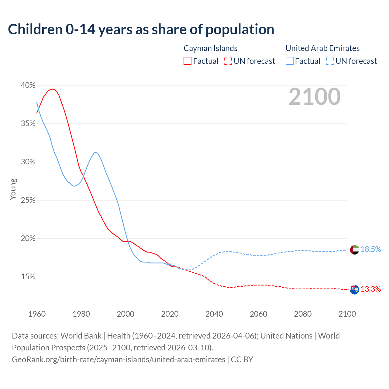 Children aged 0-14 make up 16.2% of the population in the Cayman Islands and 16.1% in the United Arab Emirates in 2024, compared to 22.3% and 29.6% respectively in 1990.