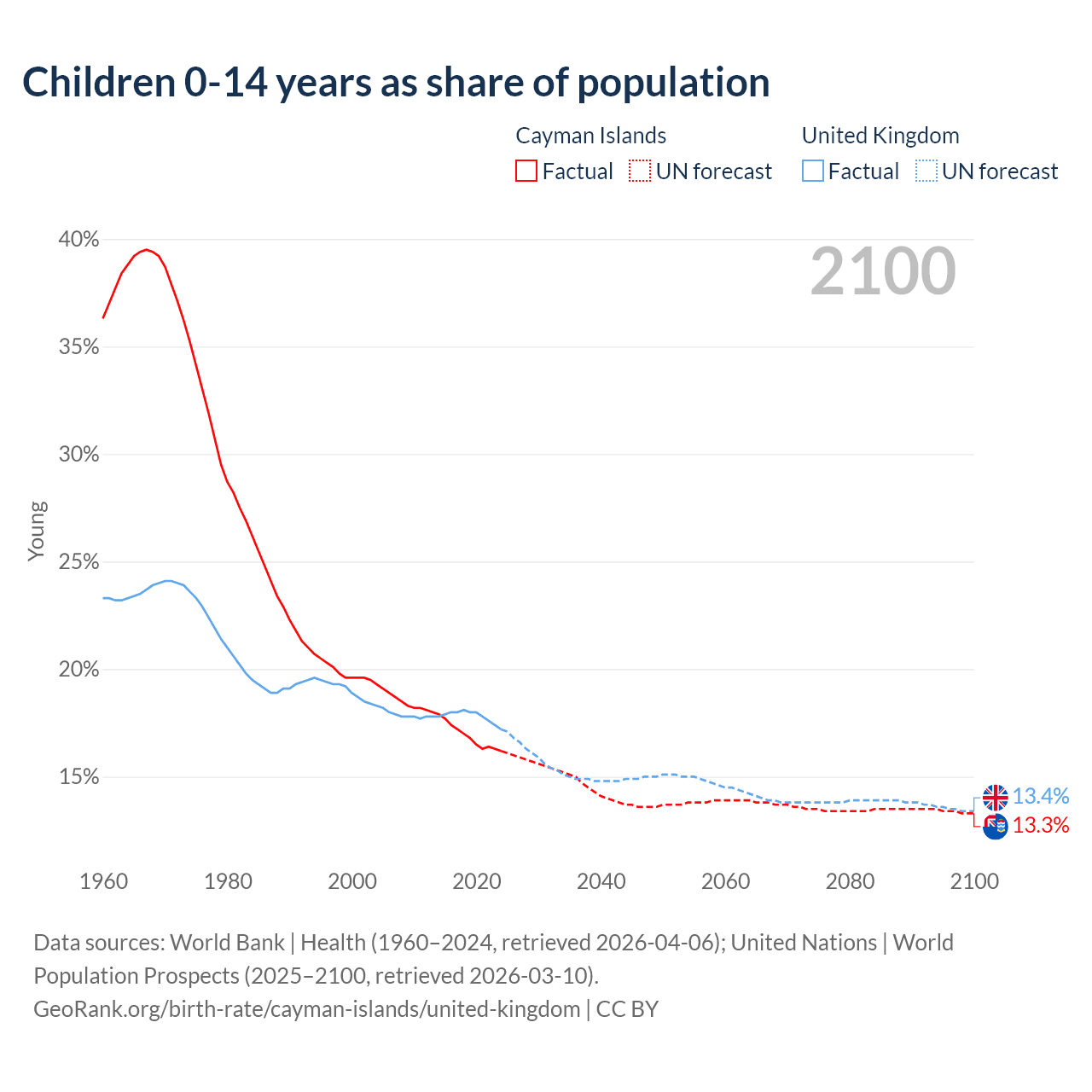 Children aged 0-14 make up 16.2% of the population in the Cayman Islands and 17.2% in the United Kingdom in 2024, compared to 22.3% and 19.1% respectively in 1990.