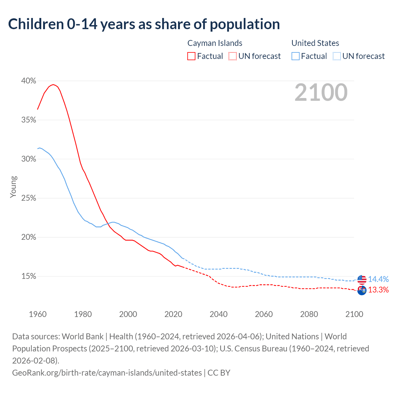 Data sources: World Bank | Health (1960–2024, retrieved 2026-04-06); United Nations | World Population Prospects (2025–2100, retrieved 2026-03-10); U.S. Census Bureau (1960–2024, retrieved 2026-02-08).