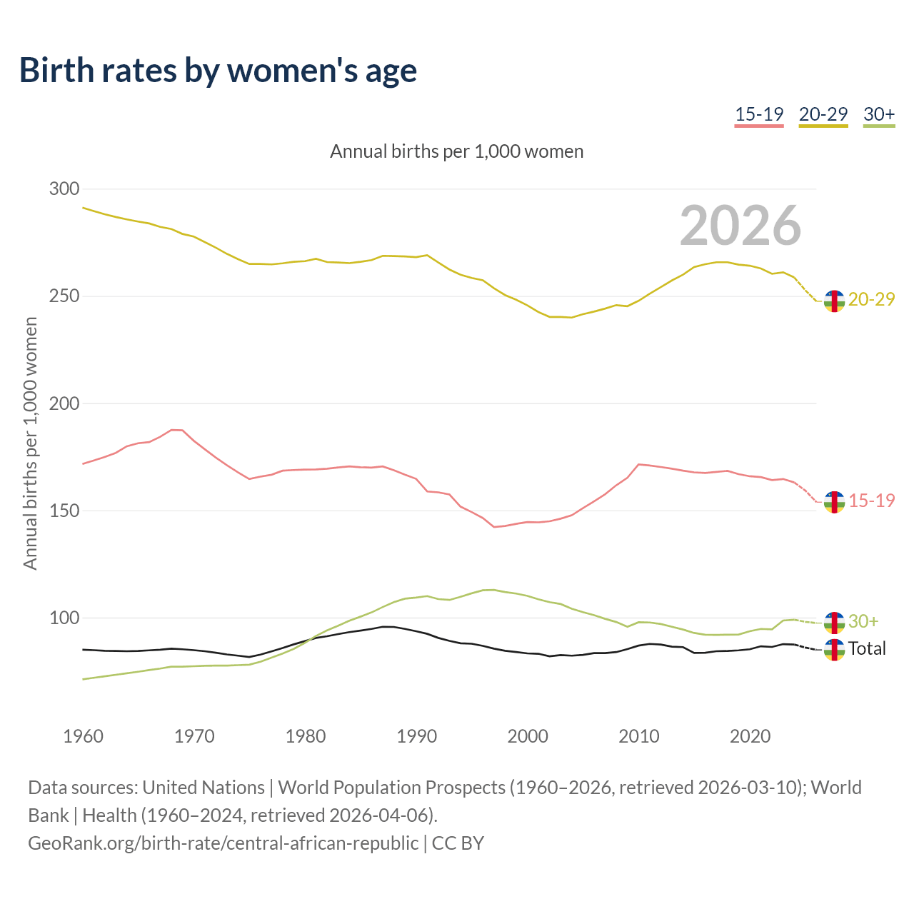 According to the latest birth rate data available, the fertility rate in the Central African Republic is 6.01, which is above the replacement level of 2.1 children per woman. In 1993, the fertility rate was 5.93 — a 1.45% increase in 30 years.