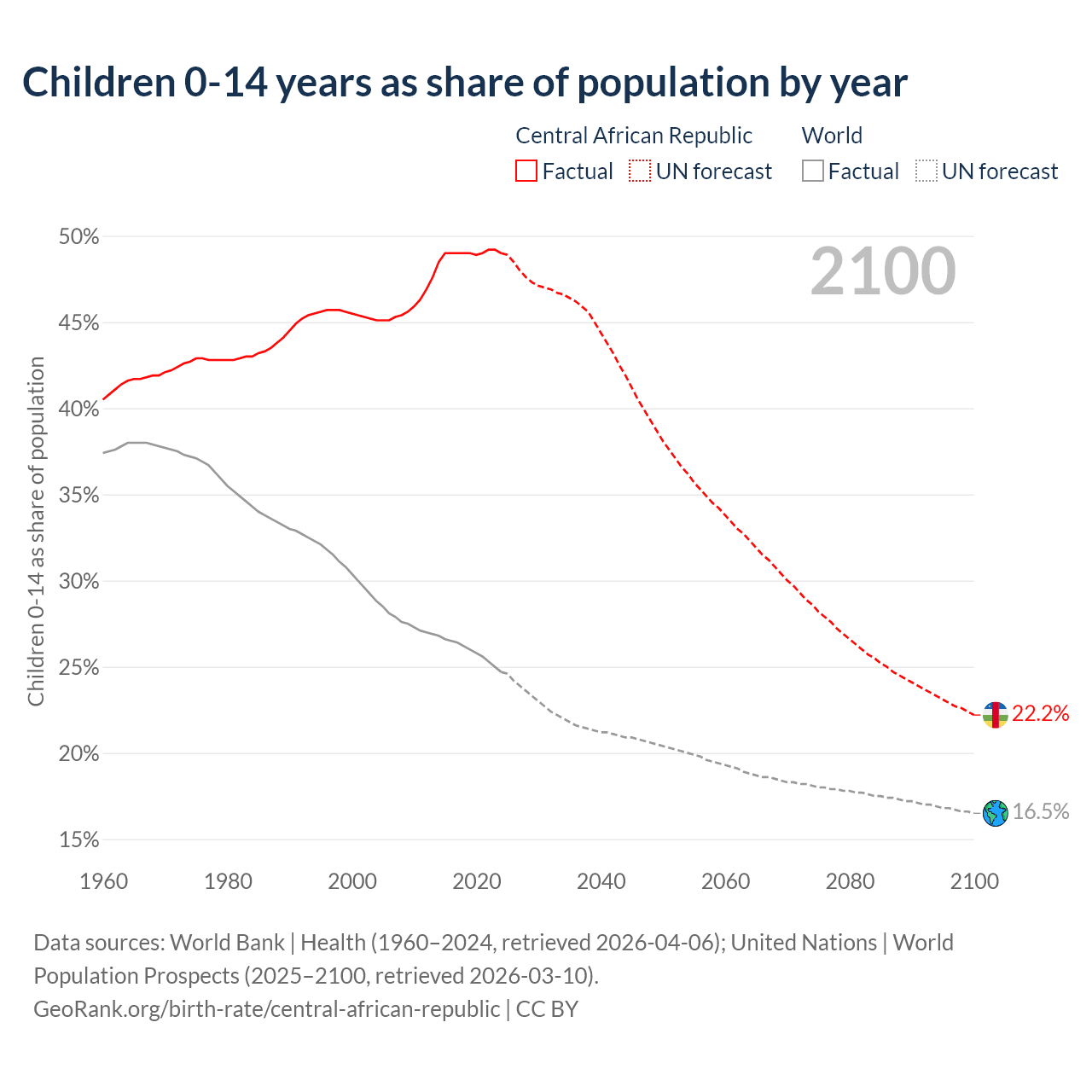 The Central African Republic has a birth rate of 46.4 (annual births per 1,000 people) and a fertility rate of 6.01 (the average number of children a woman is expected to have over her lifetime based on current age-specific birth rates).