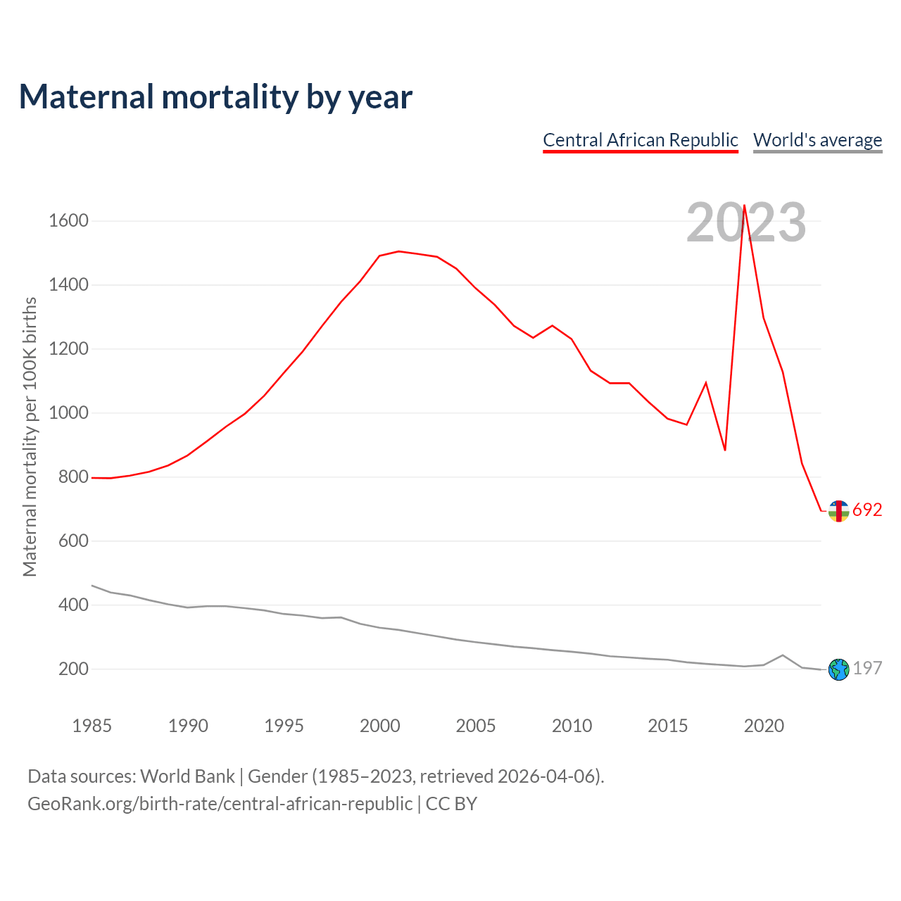 The maternal mortality rate in the Central African Republic was 692 deaths per 100,000 live births in 2023 — a 0.69% chance of dying during childbirth or within 42 days of pregnancy termination. This is a 53.6% decrease compared to the year 2000.