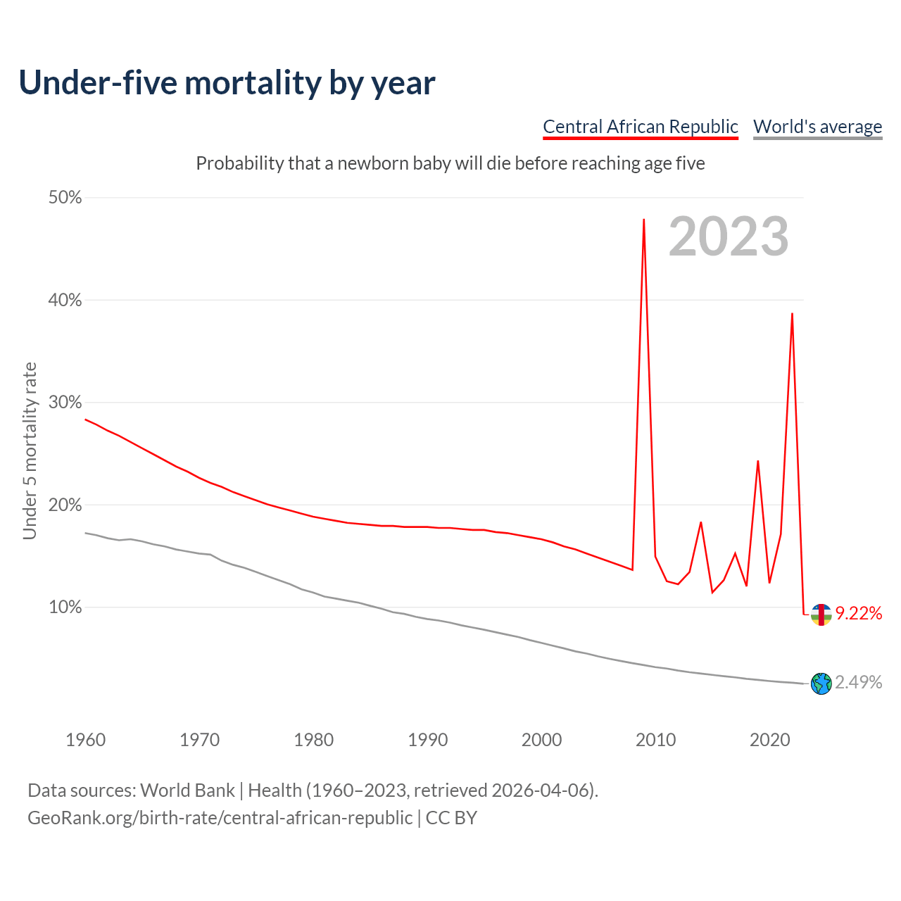 The under-5 mortality rate in the Central African Republic was 92.2 deaths per 1,000 live births in 2023 — a 9.22% chance that a newborn baby will die before reaching age five. This is down from 165.5 deaths per 1,000 live births in 2000.