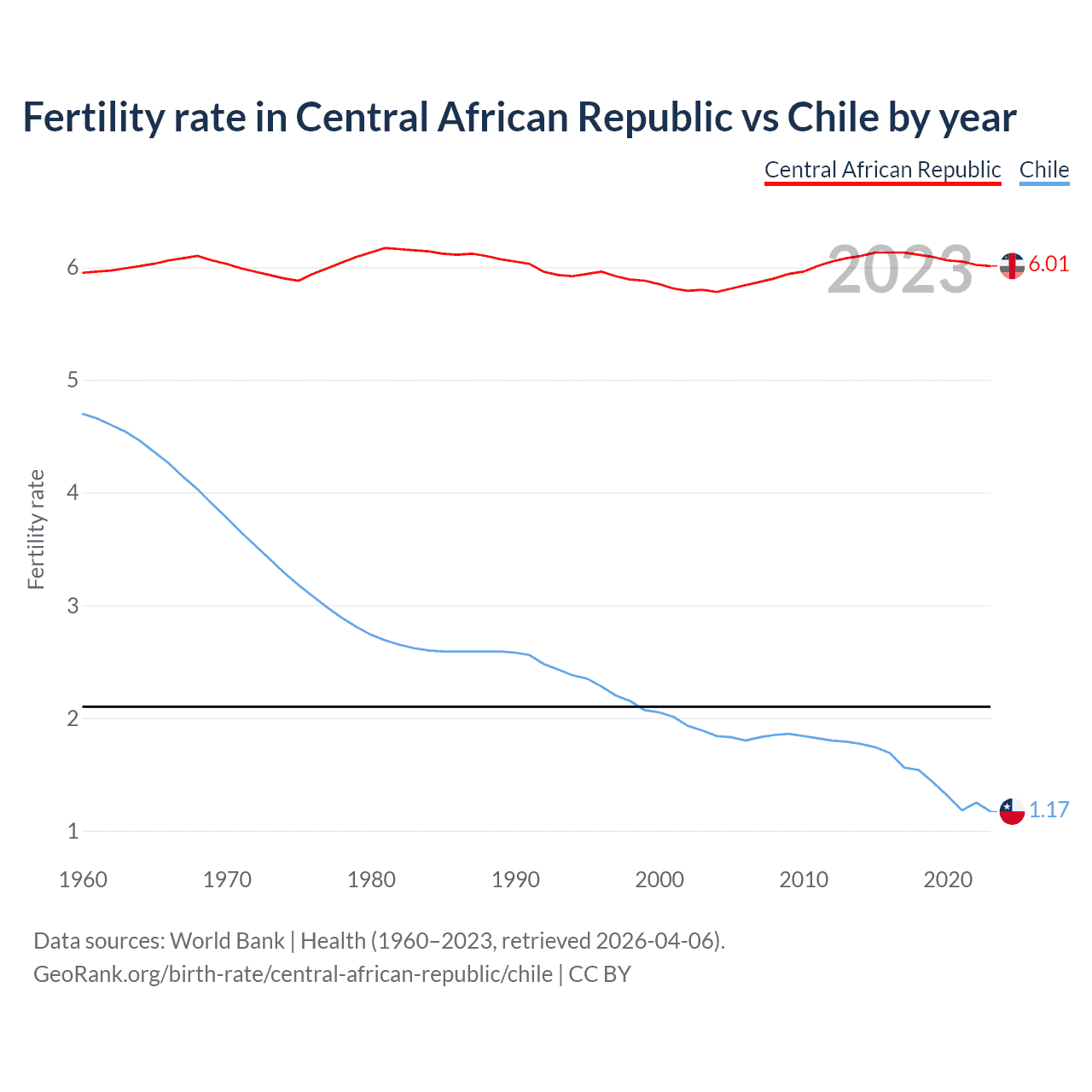 According to the latest available data on birth rates, the fertility rate in the Central African Republic was 6.01 children per woman in 2023, compared to 1.17 in Chile in 2023. The replacement level is considered to be 2.1 children per woman.