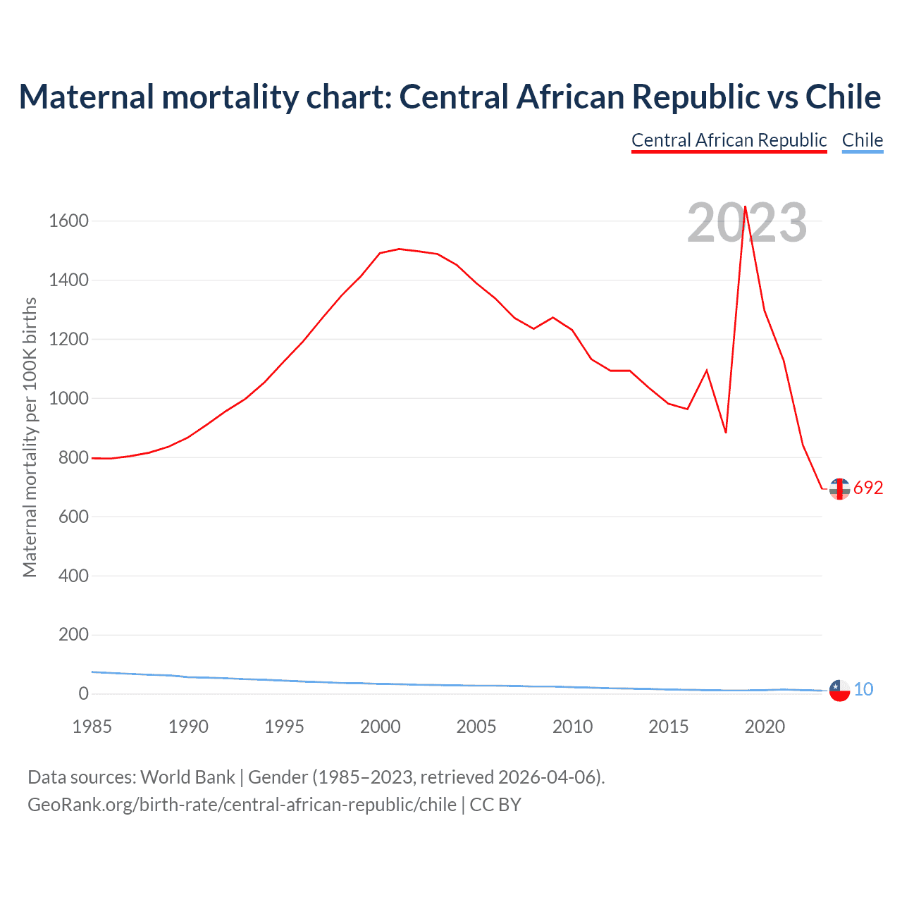 The maternal mortality rate, which is the probability of dying during childbirth or within 42 days of pregnancy termination, is 692 deaths per 100,000 live births in the Central African Republic, compared to 10 deaths in Chile.