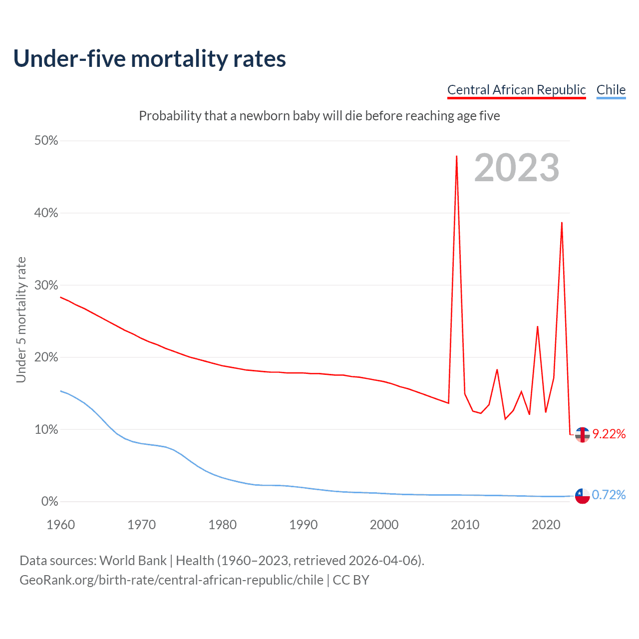 The chance that a newborn baby will die before reaching age five is 9.22% in the Central African Republic and 0.72% in Chile. Above is a chart with historical data on under-five mortality rates.