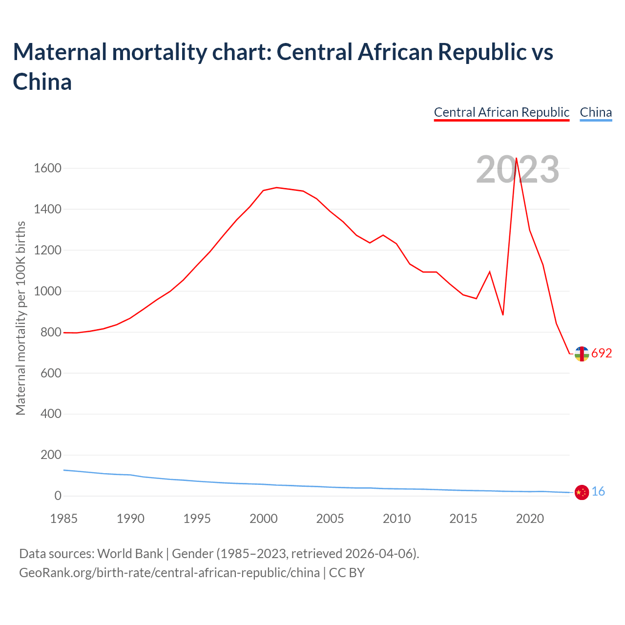 The maternal mortality rate, which is the probability of dying during childbirth or within 42 days of pregnancy termination, is 692 deaths per 100,000 live births in the Central African Republic, compared to 16 deaths in China.