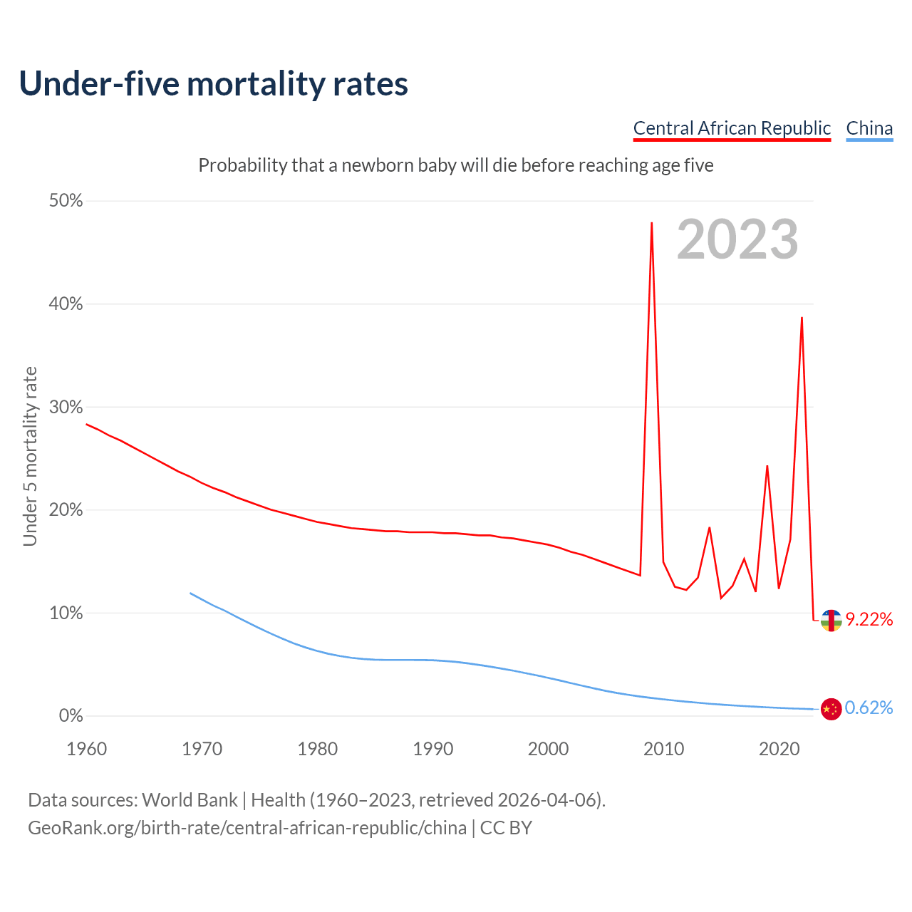 The chance that a newborn baby will die before reaching age five is 9.22% in the Central African Republic and 0.62% in China. Above is a chart with historical data on under-five mortality rates.