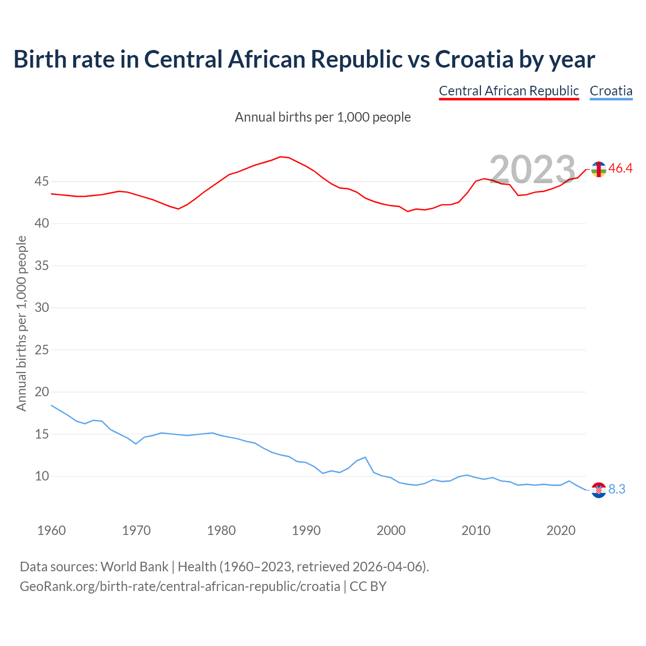 The Central African Republic has an annual birth rate of 46.4 births per 1,000 people, compared to 8.3 for Croatia. The average number of children a woman is expected to have during her lifetime — the fertility rate, is 6.01 in the Central African Republic and 1.46 in Croatia — 75.7% difference.