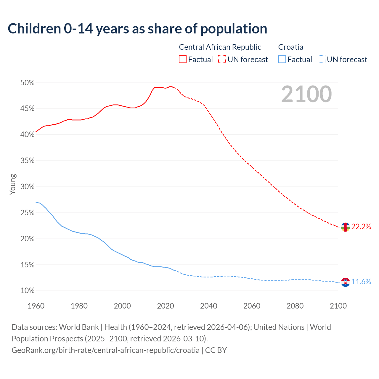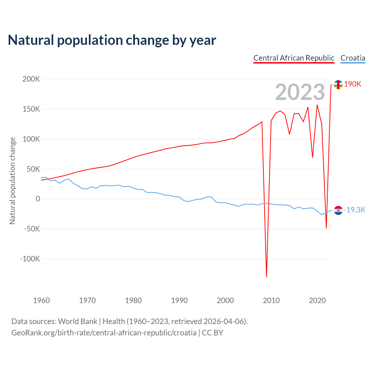 According to the latest available data on birth rates, the fertility rate in the Central African Republic was 6.01 children per woman in 2023, compared to 1.46 in Croatia in 2023. The replacement level is considered to be 2.1 children per woman.