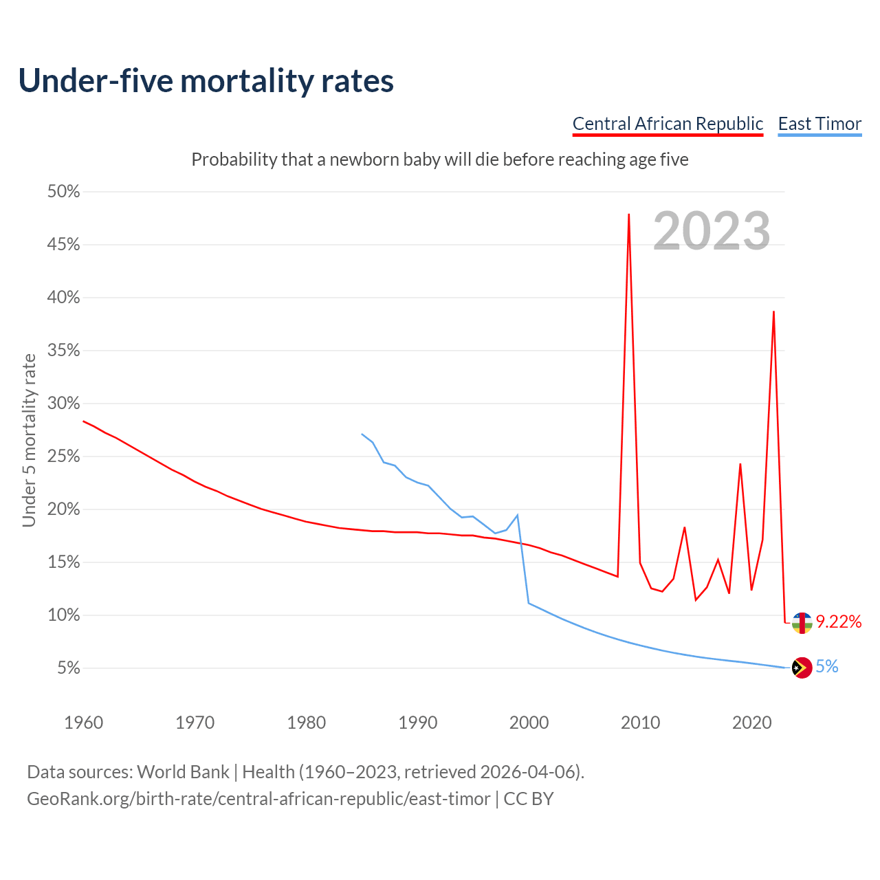 The chance that a newborn baby will die before reaching age five is 9.22% in the Central African Republic and 5% in East Timor. Above is a chart with historical data on under-five mortality rates.